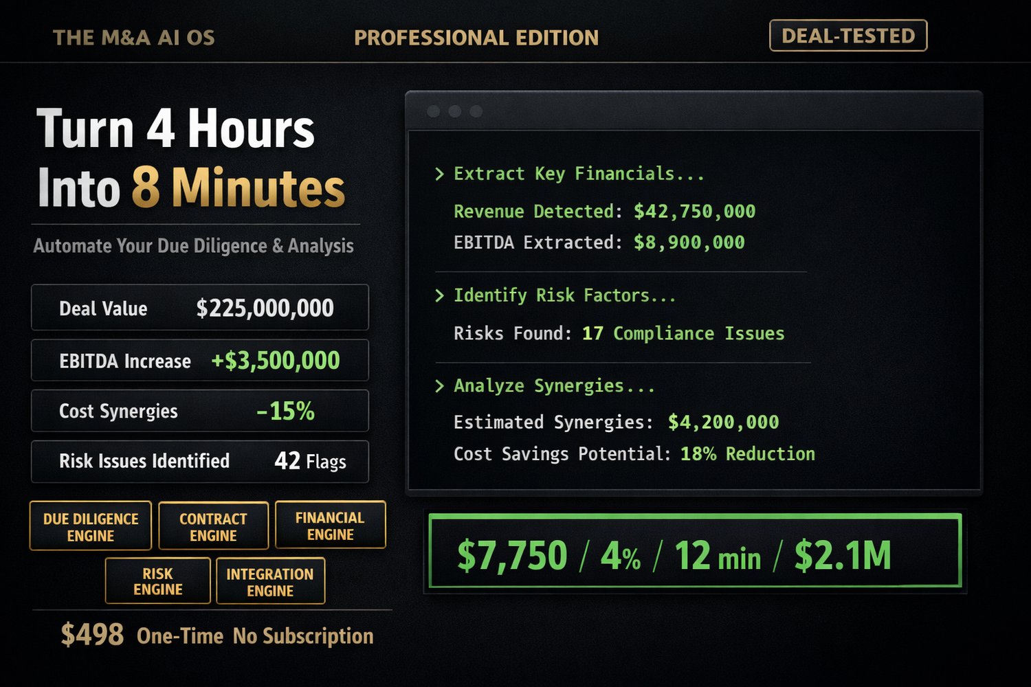 The numbers: โ 7โ8 min vs. 4 hours traditional review โ 3,000% time recovery per diligence cycle โ $7,750 saved per deal in billable hours โ $0 new software required โ Works with ChatGPT, Claude, and local LLMs