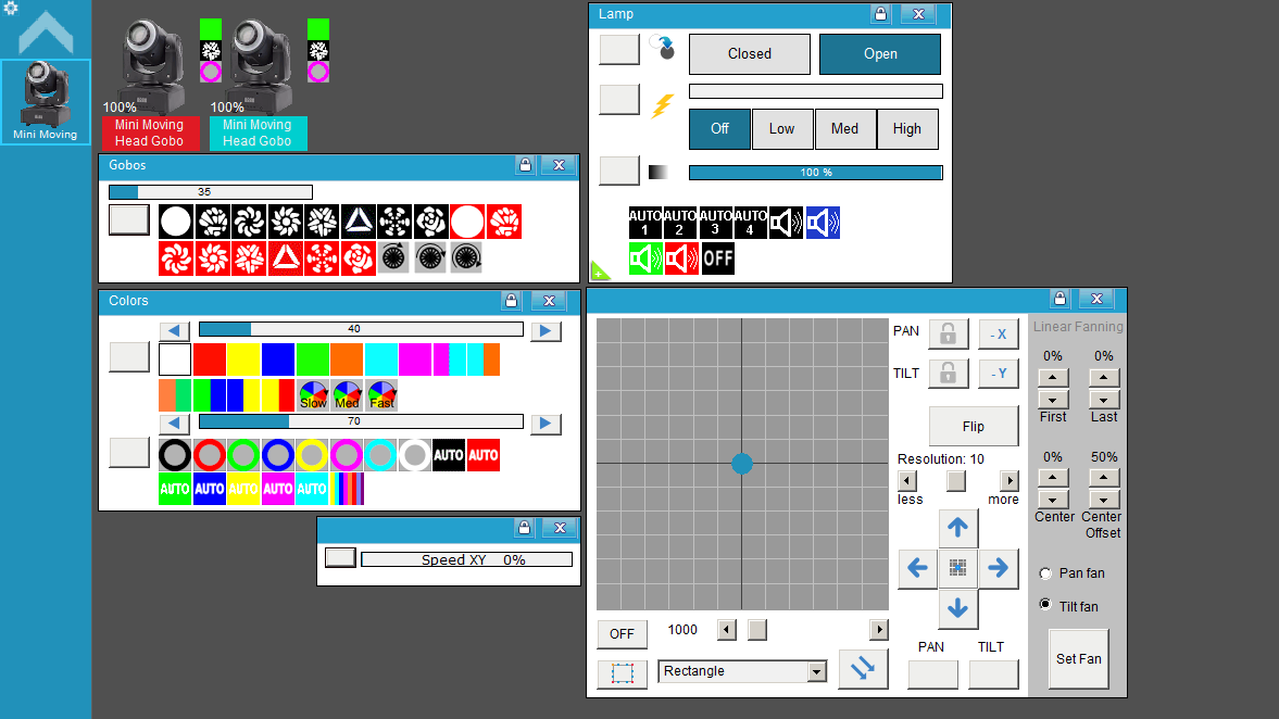 * En el modo de 12CH Verifique, con un Fixture de pruebas (click), que coincidan estos canales: 8 Dimmer, 5 en el valor 40 = Color Verde, 6 en el valor 32 = Gobo de la cuarta foto.