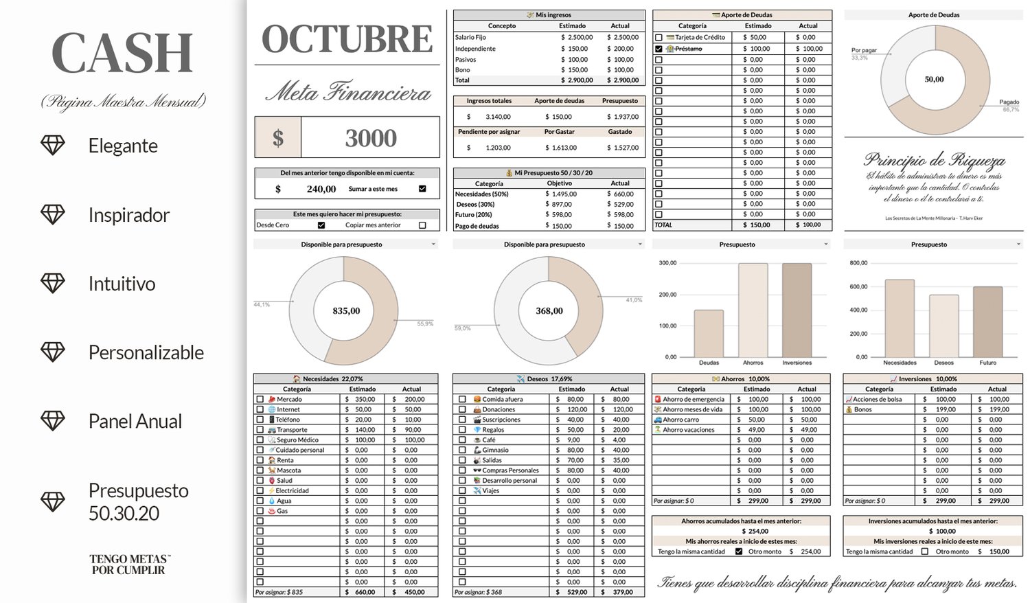 - Elegante: Llevar tus finanzas ahora se hace con estilo. Cada detalle fue diseñado y personalizado para que disfrutes plenamente del uso del planner.