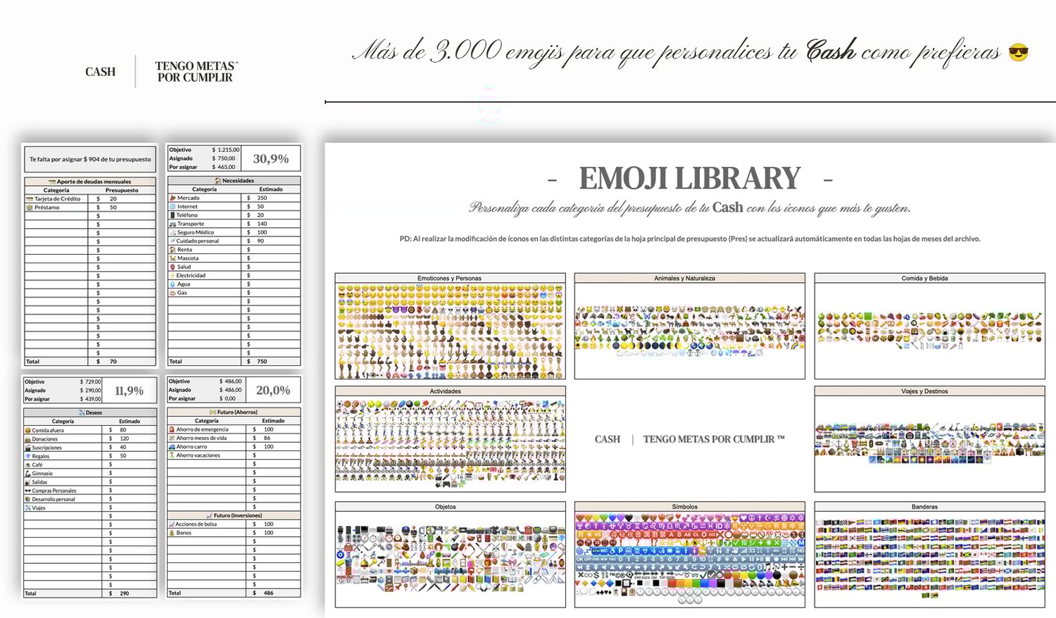 - Personalizable: Podrás adaptar cada categoría con el nombre y emoji de tu preferencia. Una vez personalices la hoja de Panel de Control, se reflejarán las modificaciones en todo el documento.