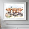 Watercolour Illustration of 3 x HIGHLAND COWS peeking over a Wall - 1 x PNG