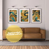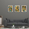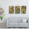 Keys: abstract, art, vibrant, bright, color, square, set, 3, deco, poster, wall art, new home, room decoration, cactus flowers, liquid, gold, blue, art.