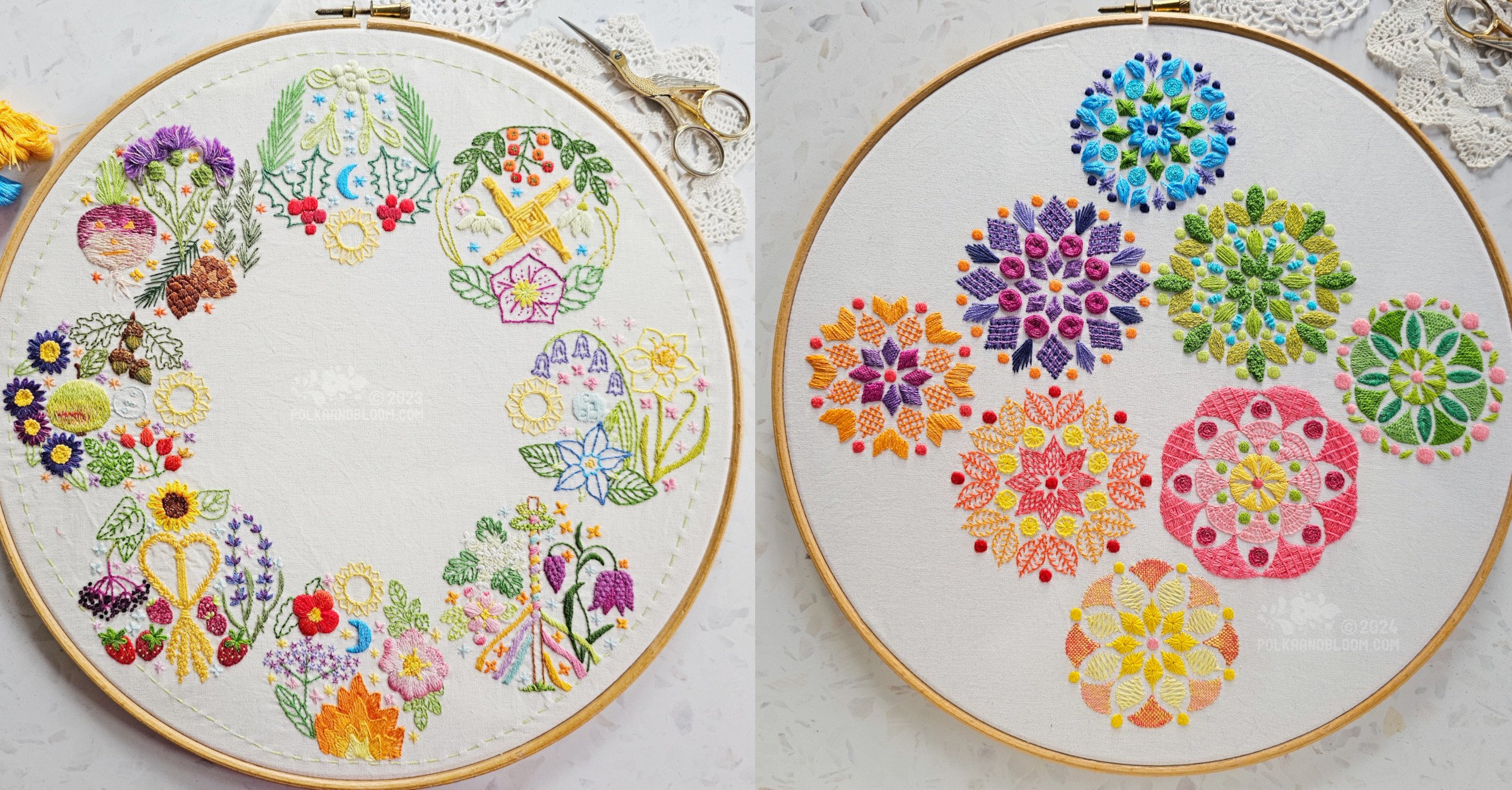 The bundle includes two large (they just fit in a 12" embroidery hoop) embroidery patterns that are a inspired by the Wheel of The Year. I originally stitched each section of the patterns to coincide with the different festivals in the Wheel. You may wish to do the same. I found it a really nice way to celebrate the rhythms of the year and nature.