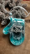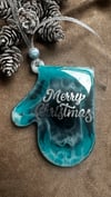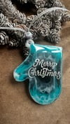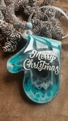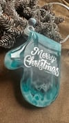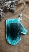 This handmade Christmas ornament in the shape of a winter mitten combines deep turquoise, snow white, and smoky black for a truly magical effect. The shimmering Merry Christmas inscription adds a festive sparkle.