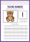 The document appears to be kindergarten math homework assignments for tracing numbers, ordering numbers, addition, and counting exercises. It includes instructions, examples, and spaces for students to show their work by tracing, cutting/gluing, filling in answers, and more. The homework covers skills like numbering, counting, addition, and place value up to 10.