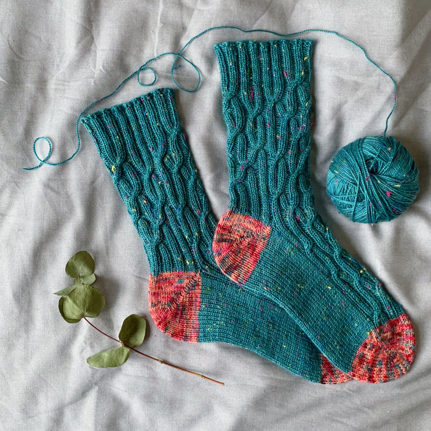 This pattern is a toe-up sock written for magic loop with a short row heel and a rib structure featuring cables.