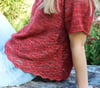 A simple raglan tee knit top down and seamlessly with an increasing garter lace panel on one side. Edges are finished with a reverse stockinette roll. The lace inset gives a slight A-line shape without increases. The amount of positive ease can vary from just a little to several inches. This is an easy knit that works up quickly!