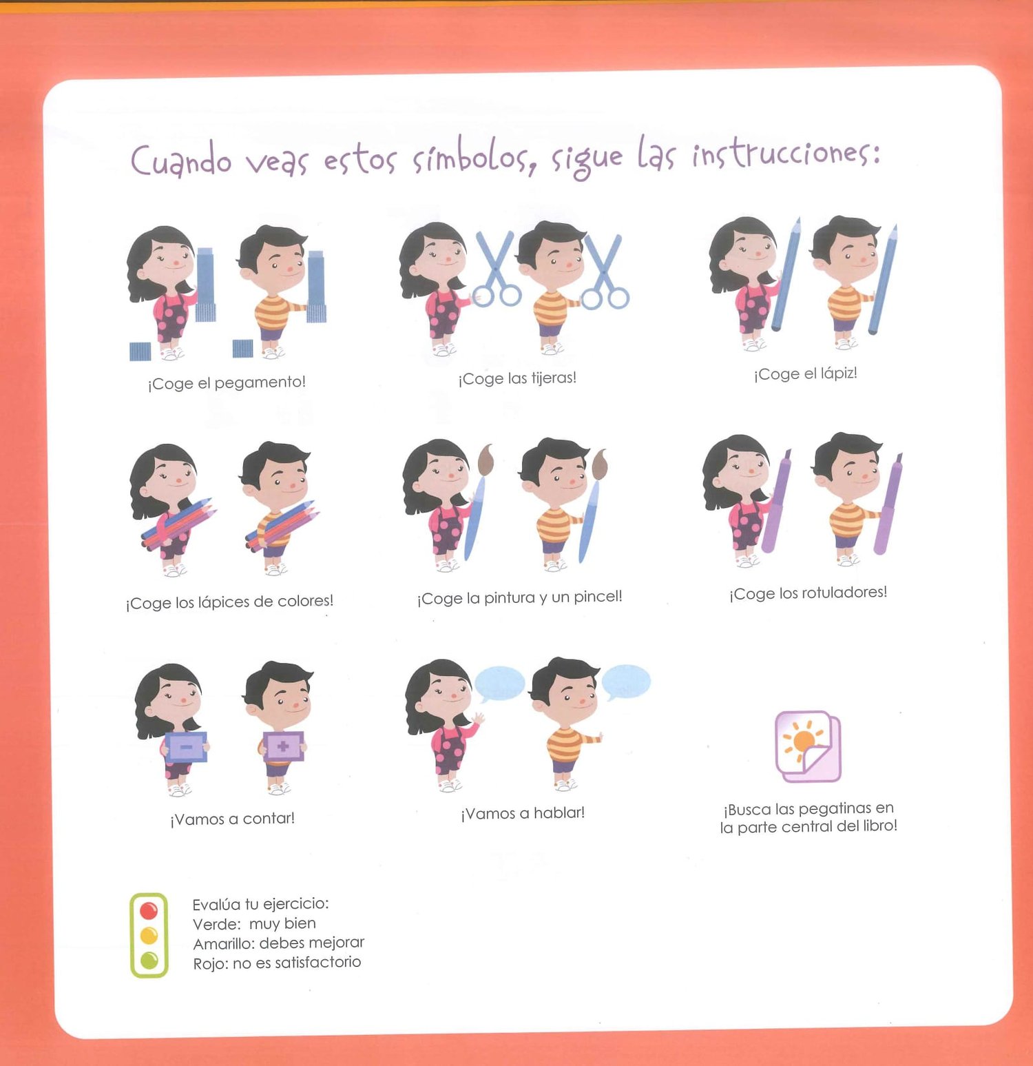 Los personajes Rocío y Javier acompañan al alumnado a lo largo de las páginas, motivando y guiando con un tono cercano y alegre.