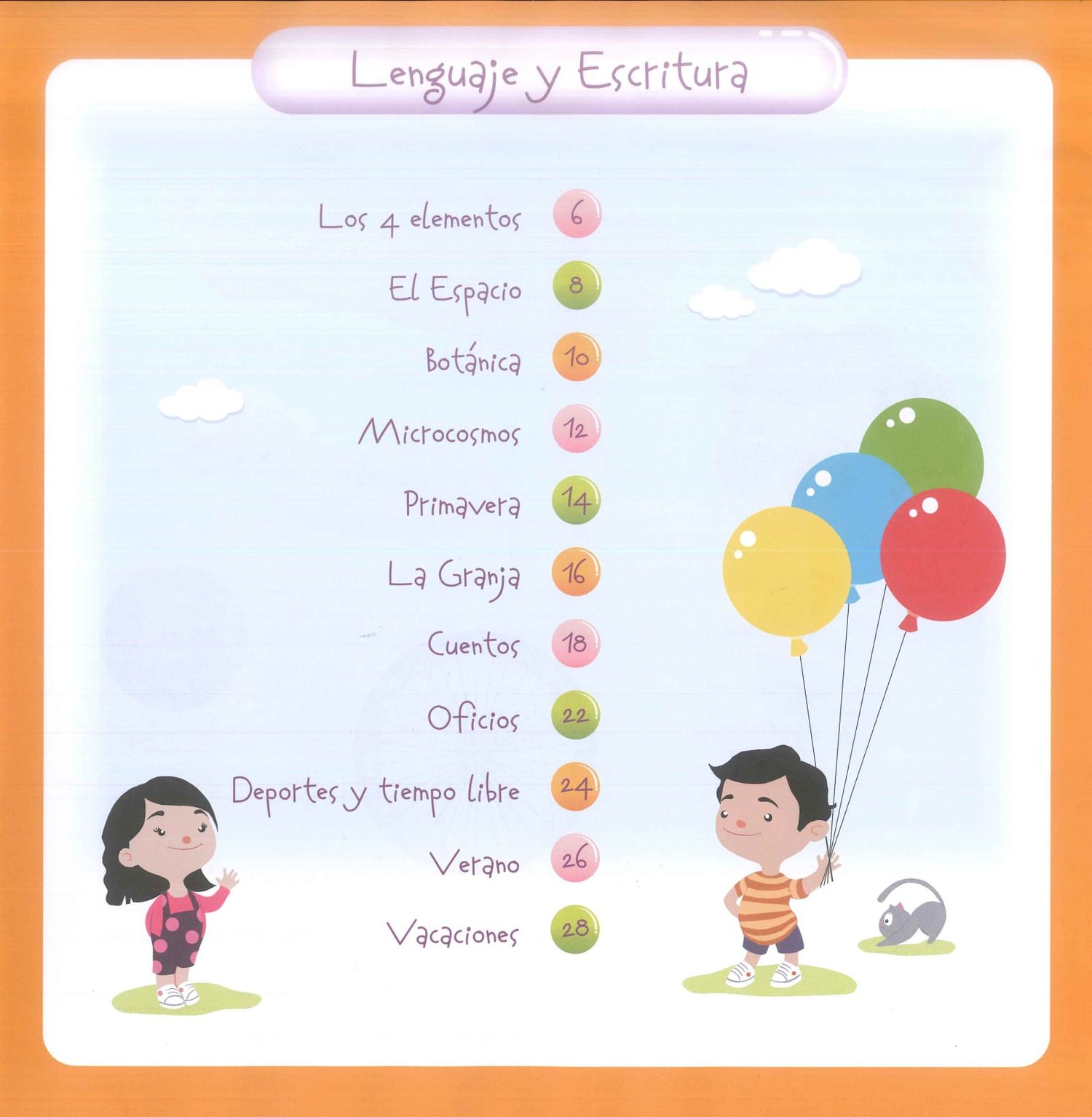 Temas estudiados: ecología, el espacio, botánica, microcosmos, primavera, la granja, , Hansel y Gretel, Pedro y el lobo, oficios, deportes y tiempo libre, verano, vacaciones. Con pegatinas en el interior - 58 páginas