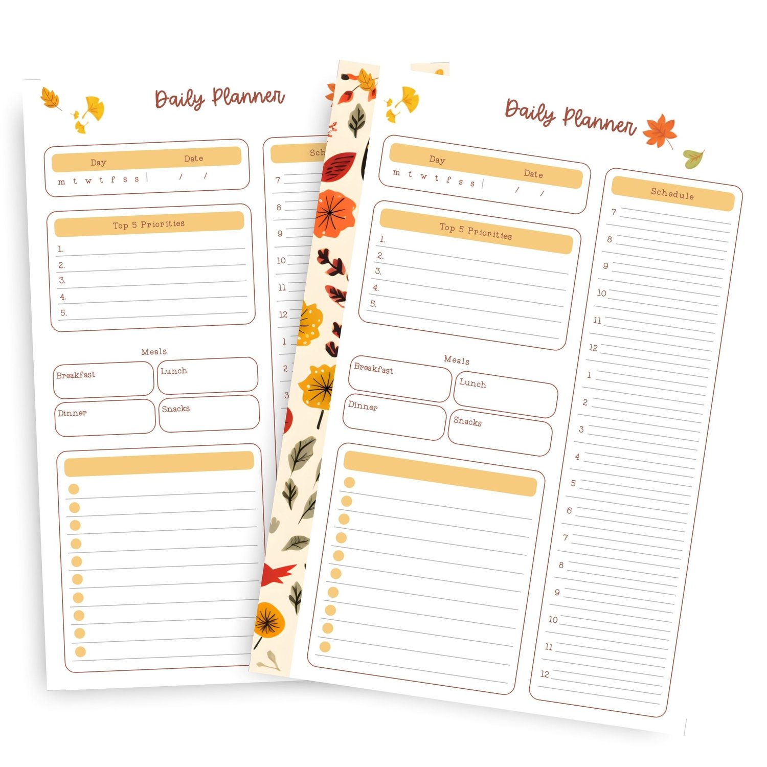 Stay focused and productive this autumn season with our charming Daily Planner, designed to help you prioritize tasks, manage time, and balance daily life. This thoughtful planner provides a cozy space to organize your day and achieve your goals.