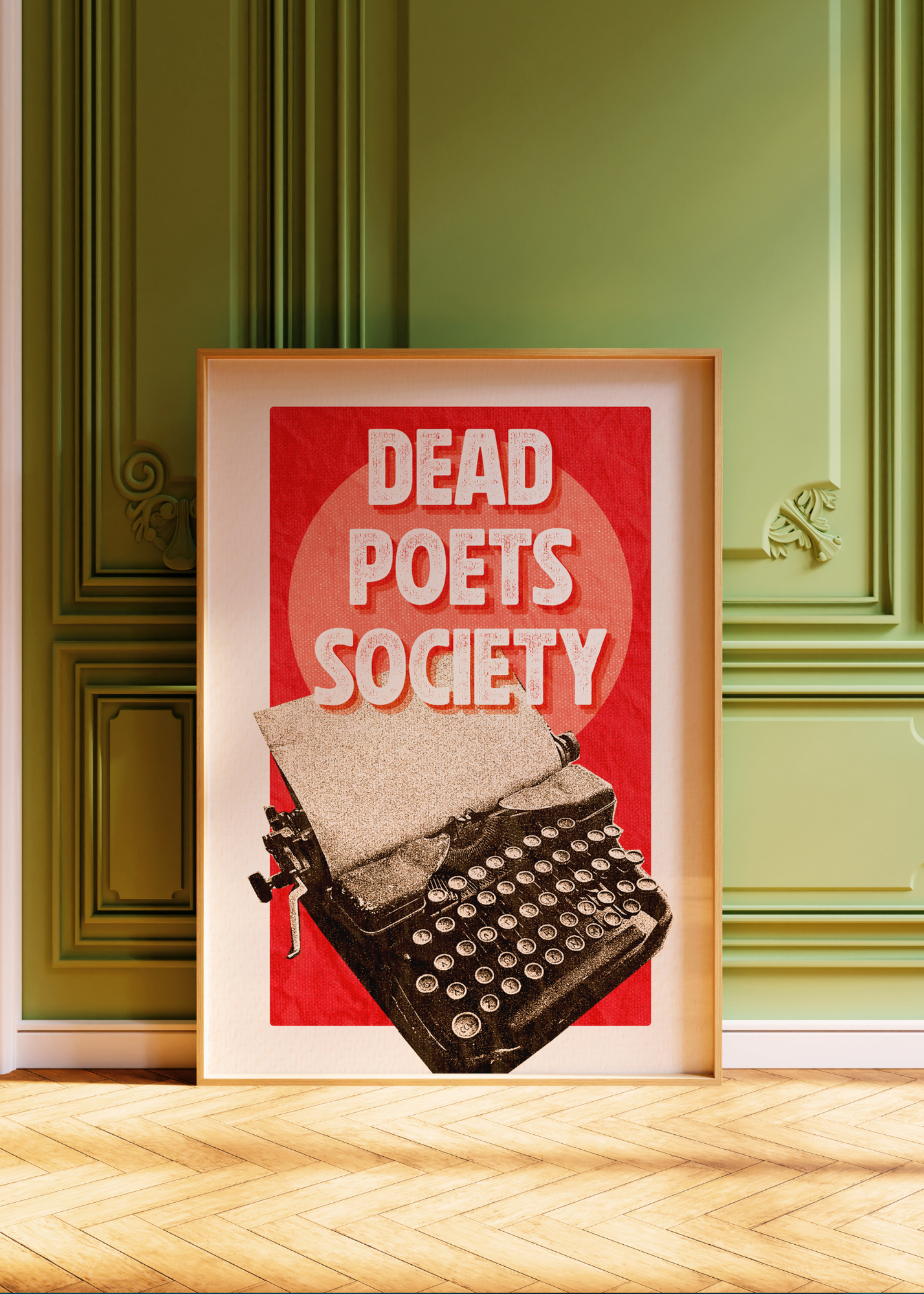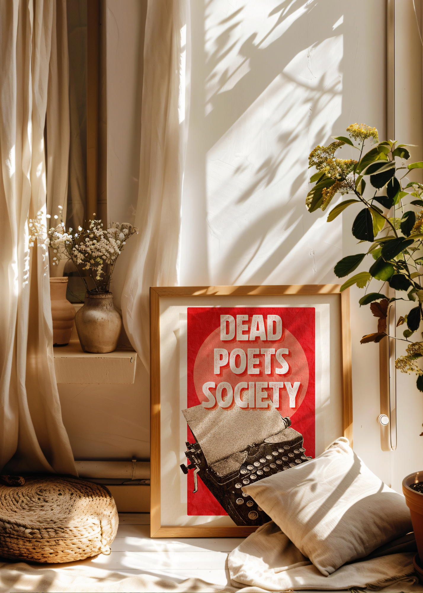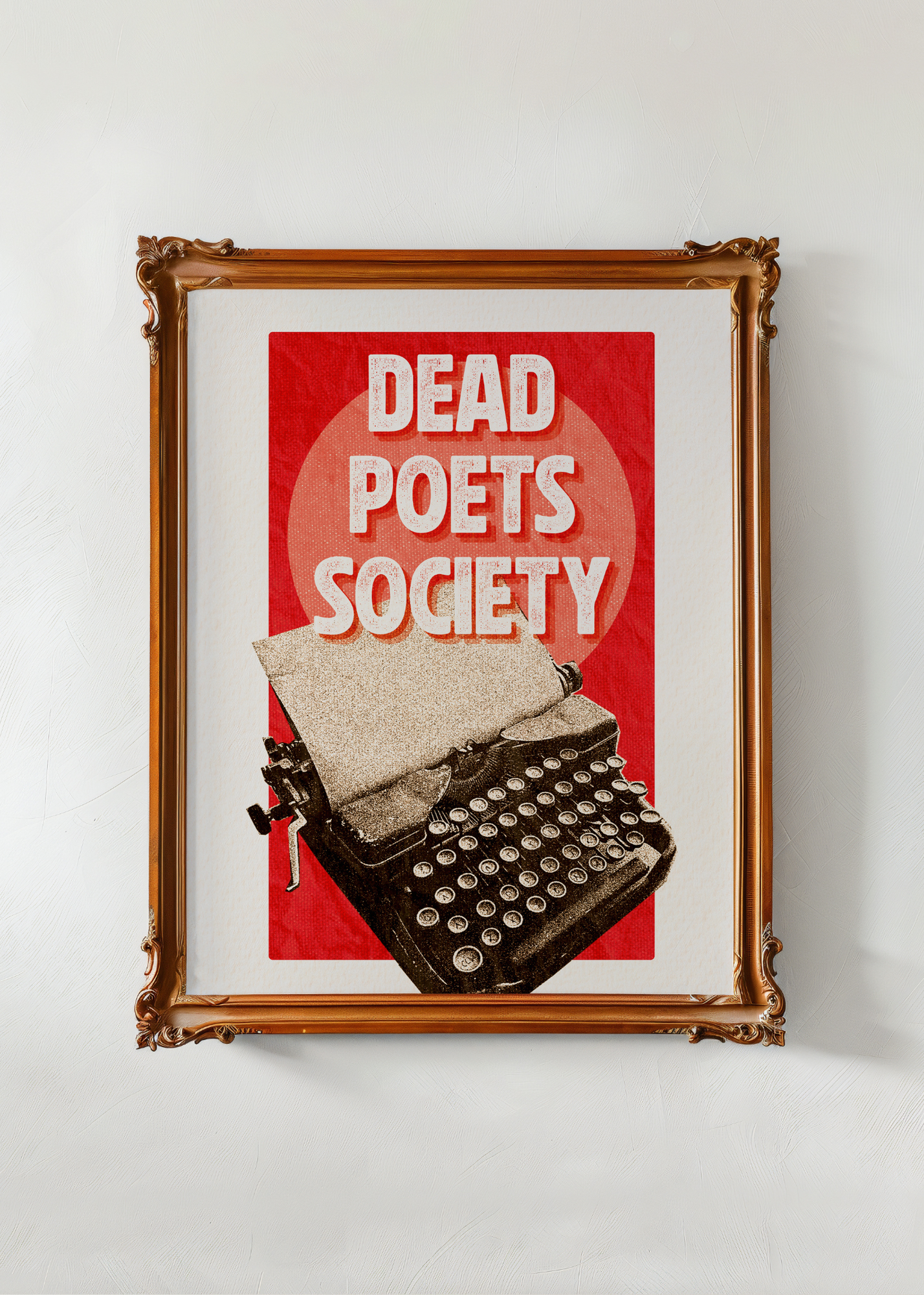 Dead Poet's Society— This one’s for the dreamers, the rebels, the ones who stand on desks. Against a striking red backdrop, a vintage black-and-white typewriter sits front and center, a sheet of paper rising from its roller with the words “Dead Poets Society” in classic white lettering. Framed in clean white and textured like old-school paper, this print pays tribute to the iconic film that made us feel everything—and reminded us to carpe diem.