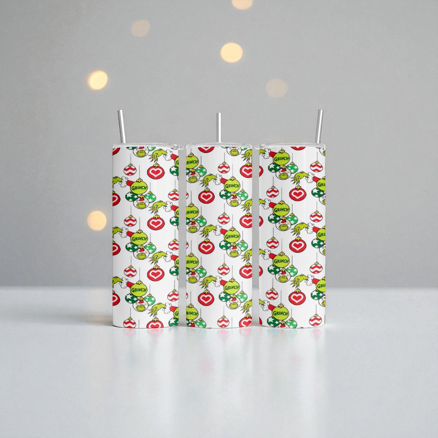 Celebrate the season with sass and sparkle—our 20oz Skinny Grinch Ornament Tumblers are bursting with holiday mischief and merry vibes! Featuring bold red, green, and white ornaments and the iconic Grinch’s mischievous grin, this tumbler is a festive favorite for fans of cocoa, coffee, and chaos.