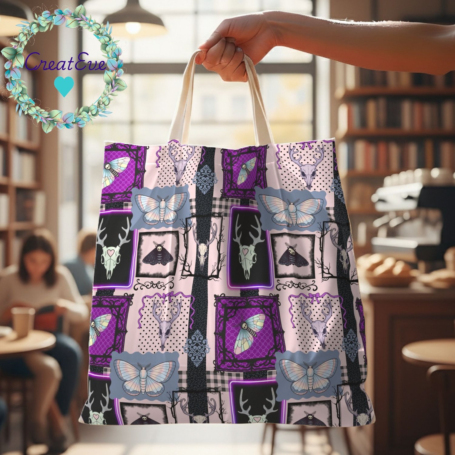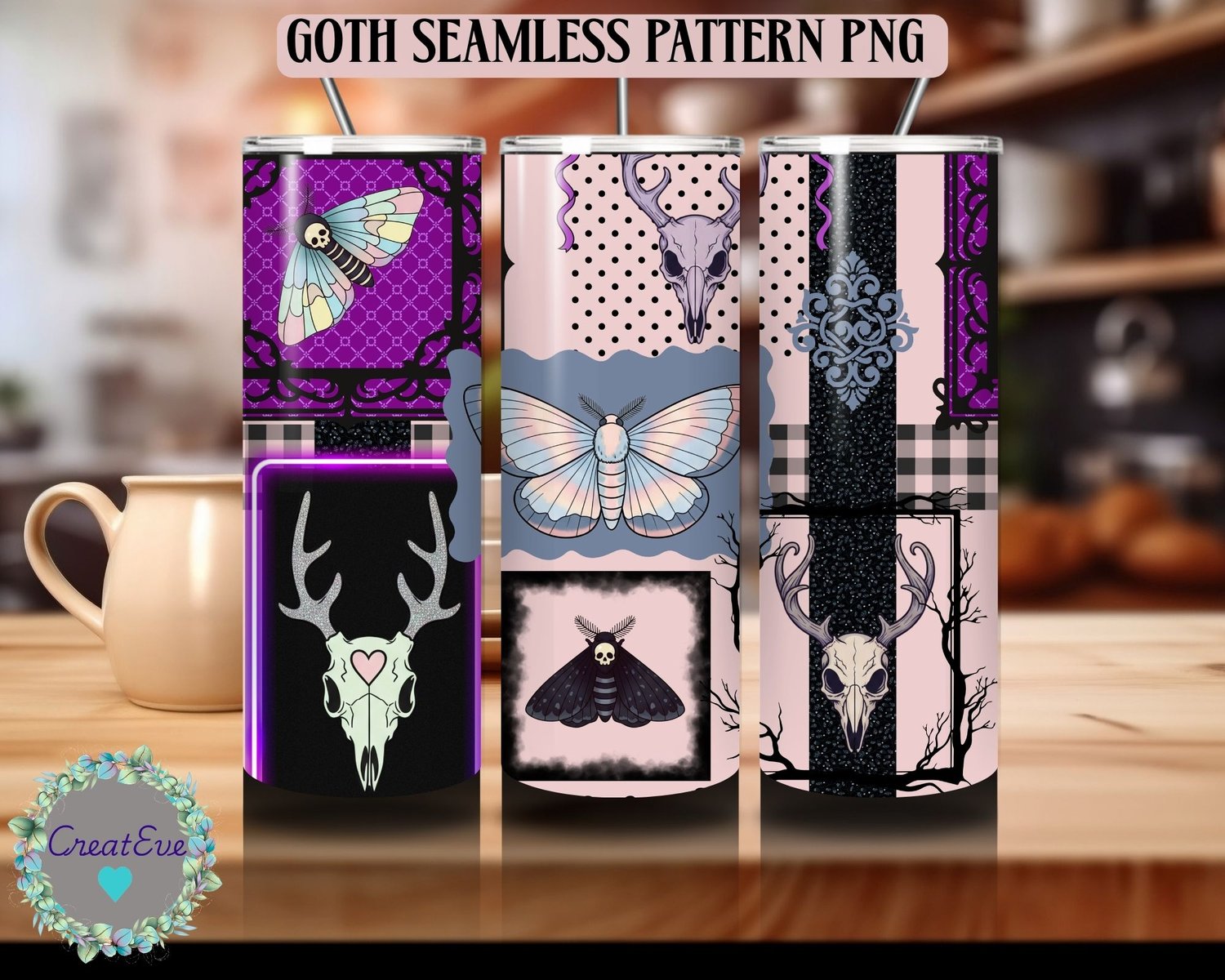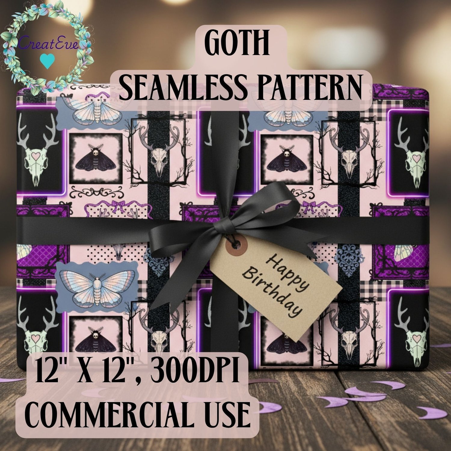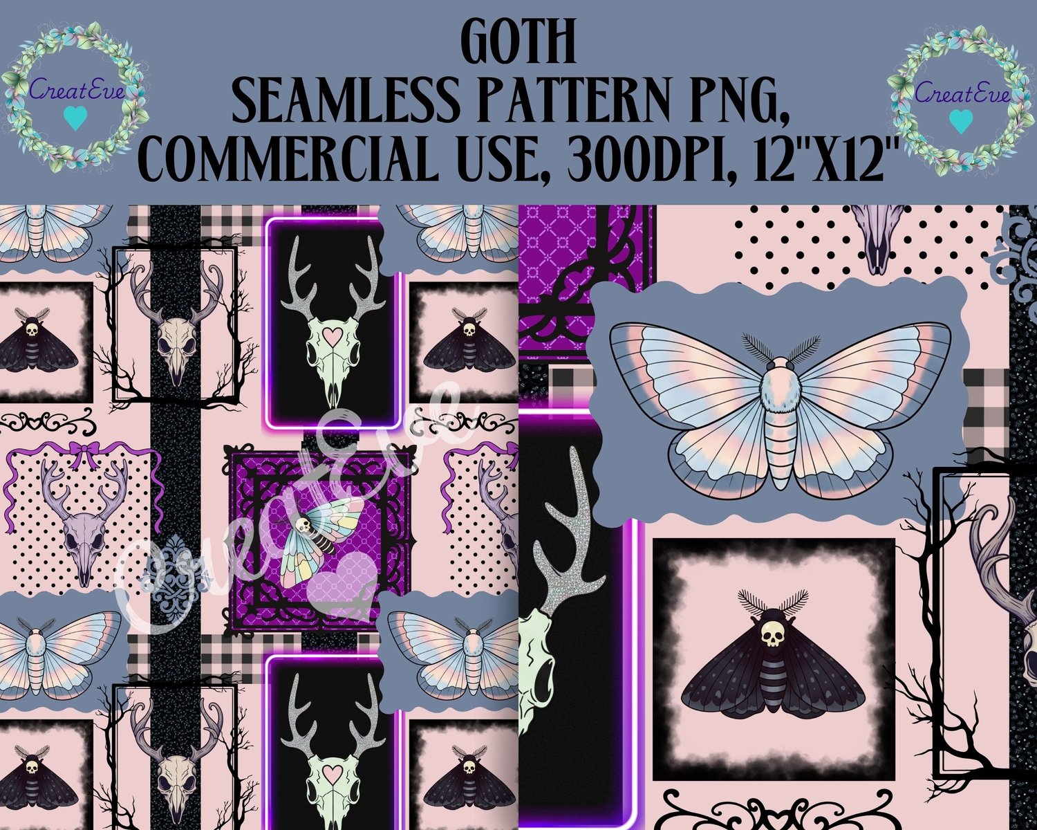 Goth Moth & Antler Deer Skull Pastel Seamless Pattern, Commercial Use, 300dpi, 12" x 12"