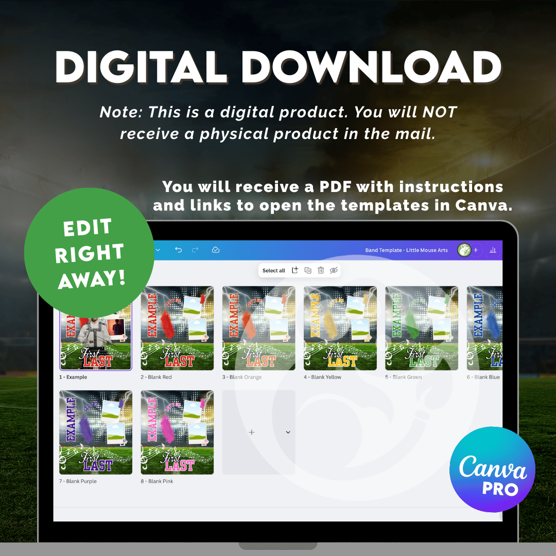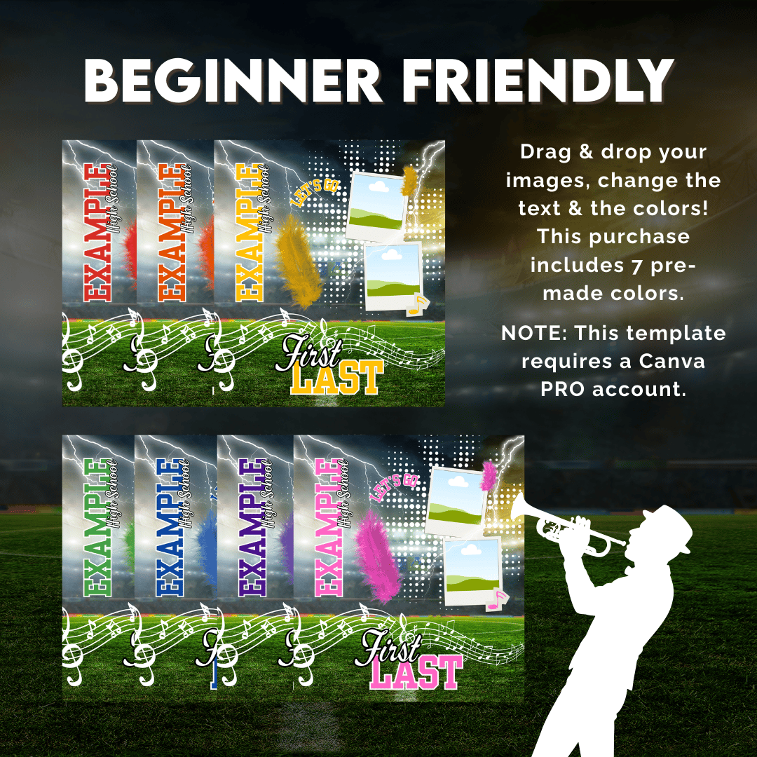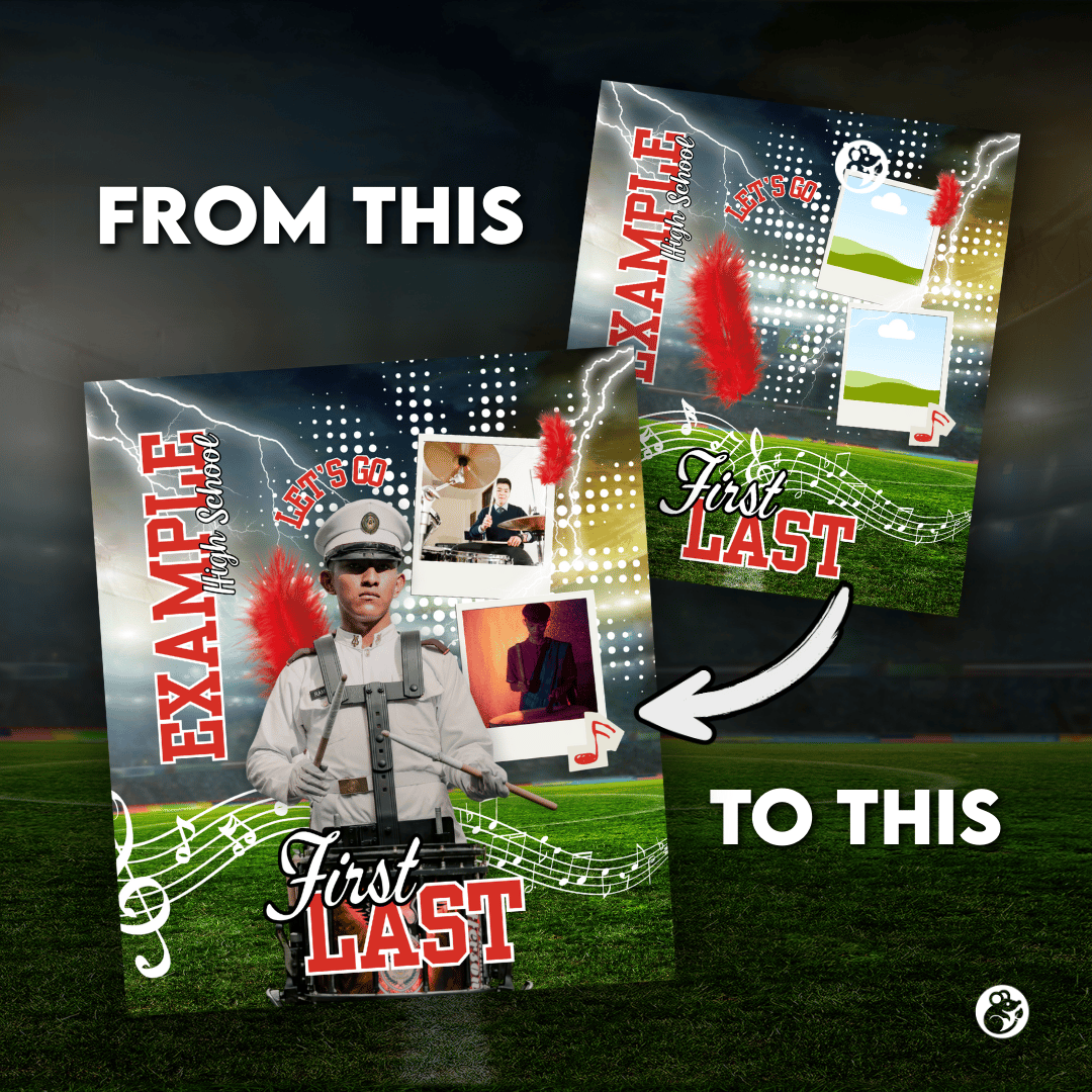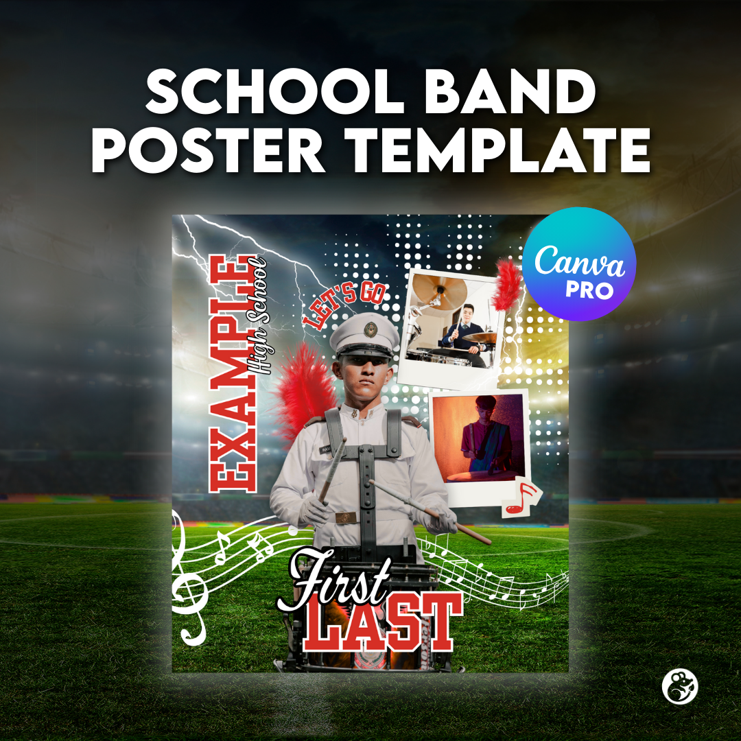 I’ve pre-made 7 color variations (red, orange, blue, green, yellow, pink, purple) so you can quickly match your school or team colors. Just drop in your musician’s photo, update the text (name, school, year, etc.), and export your finished design!