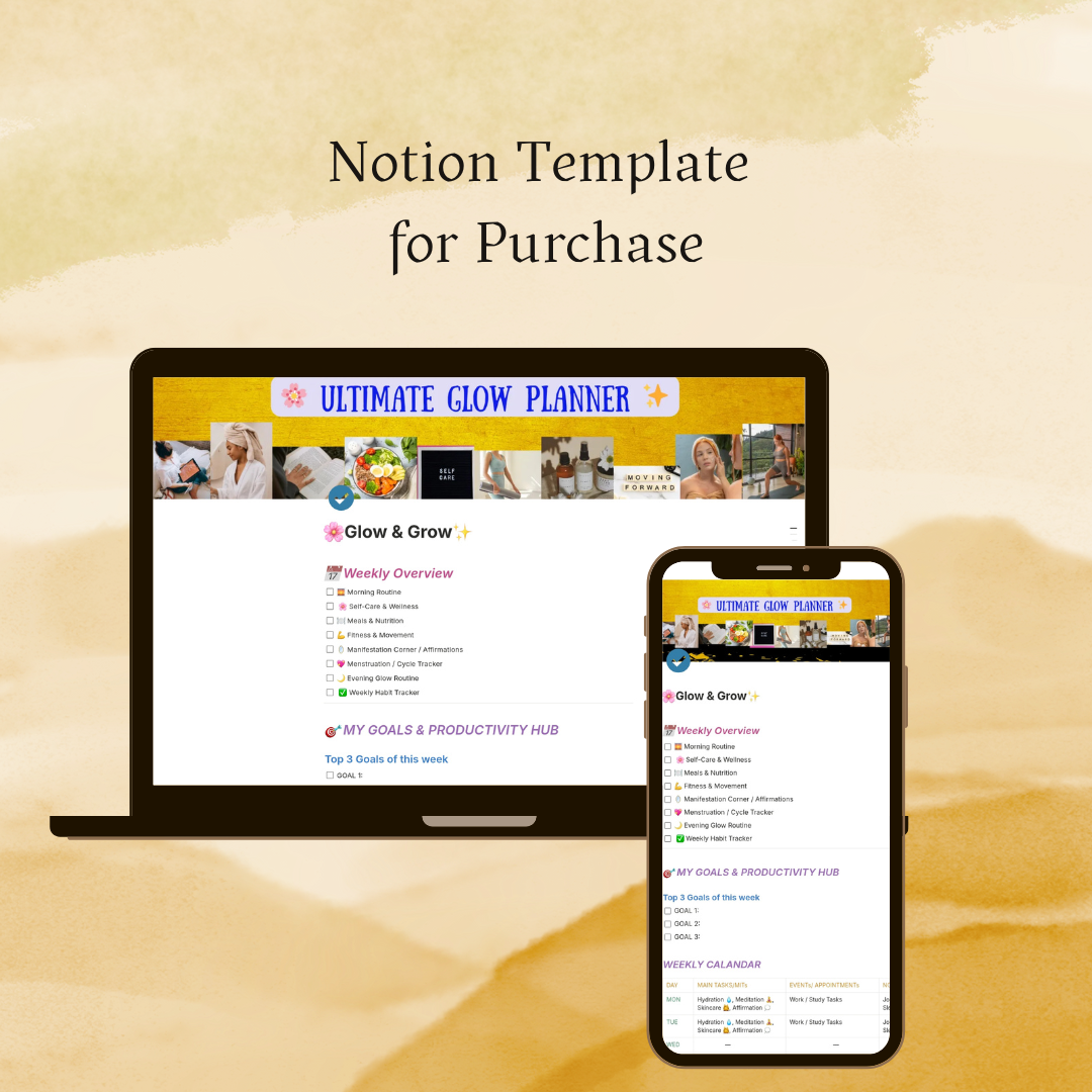 No need for 2 or 3 separate templates, this single, all-in-one Notion planner has everything you need to stay organized, mindful, and glowing every day. ✨