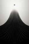 A mesmerizing black and white portrayal of flowing forms converging toward a solitary, radiant emblem and a journey along the surreal wooden path to majestic mountain peaks cloaked in mist. Serie of three pictures. Ideal for Print on Demand products.