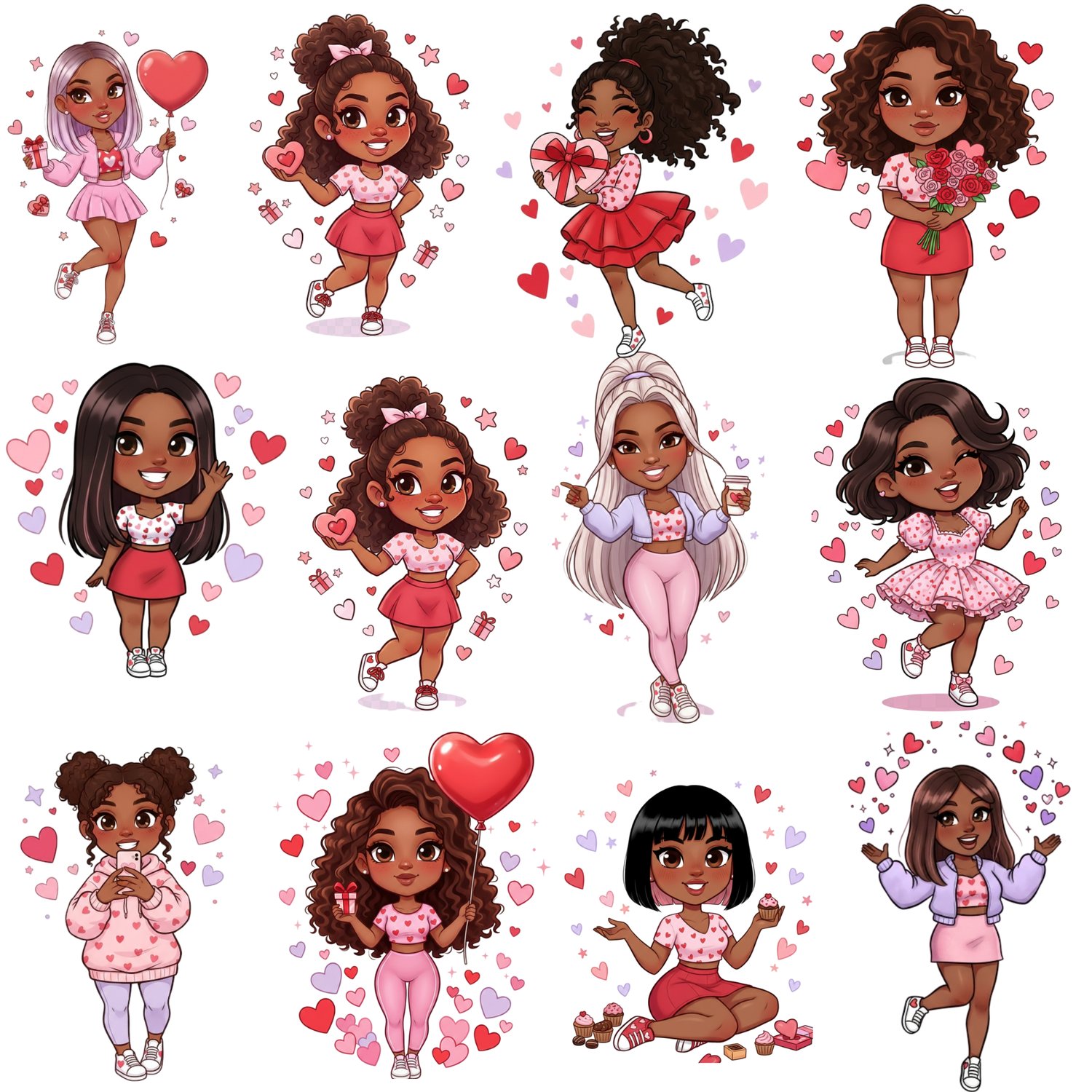 Bring Valentine vibes to your projects with 11 full-body, playful Black girl chibi PNGs!