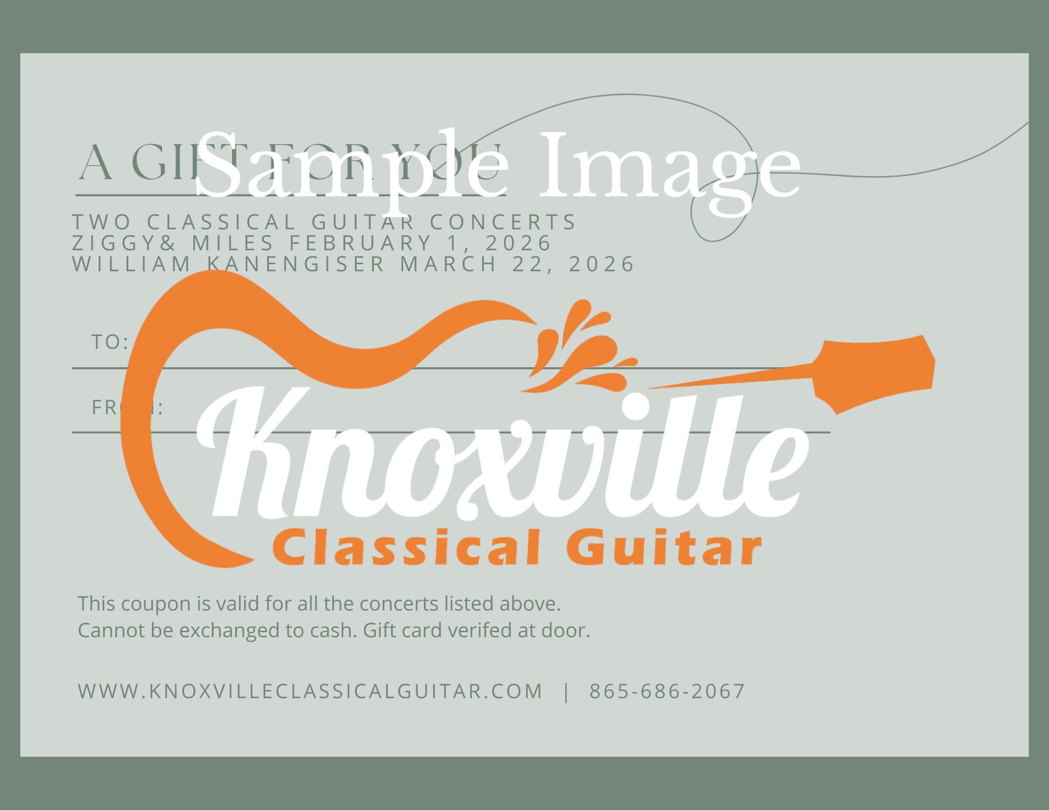 This certificate entitles the bearer to admission to two separate concerts in the upcoming Knoxville Classical Guitar season: one featuring William Kanengiser and another featuring the extraordinary guitar duo Ziggy & Miles. Each event is on its own date; the holder may choose one ticket per concert (two in total).