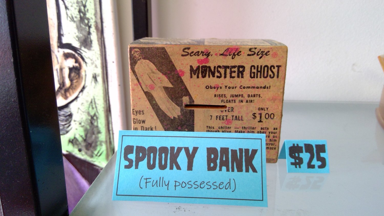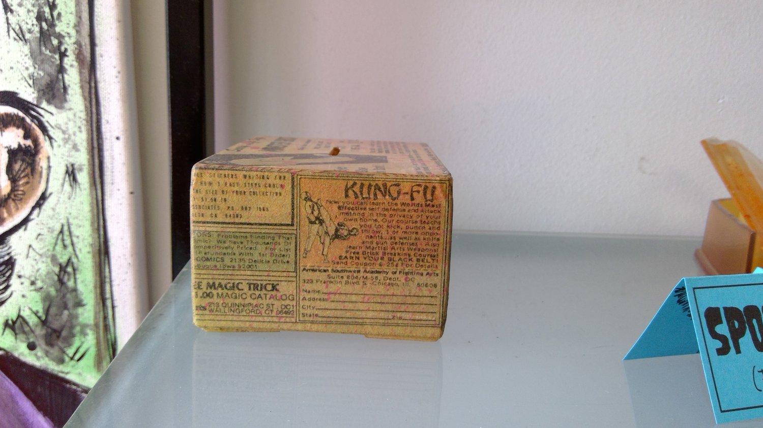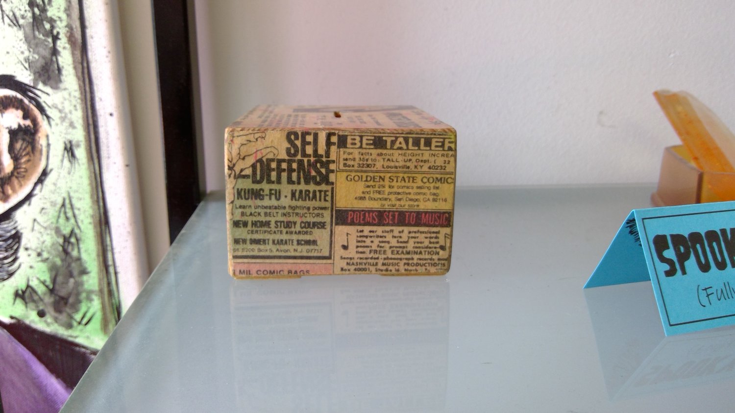 This is a coin bank that I adhered old comic book pages to. May or may not be possessed.