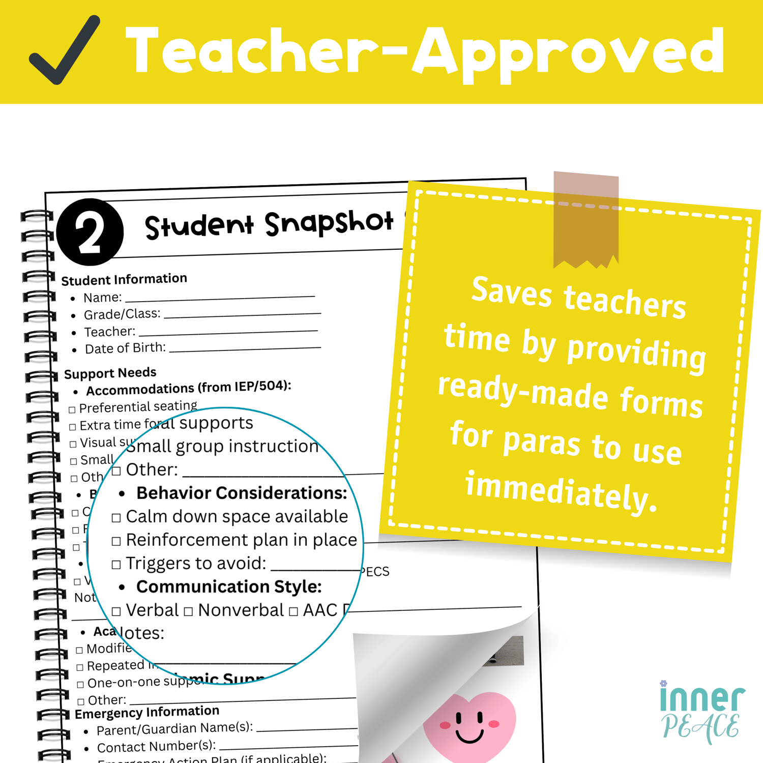 Designed with ready-to-use templates and editable pages, this binder provides the tools paras need to track schedules, student information, responsibilities, and communication—making daily tasks easier and more efficient.