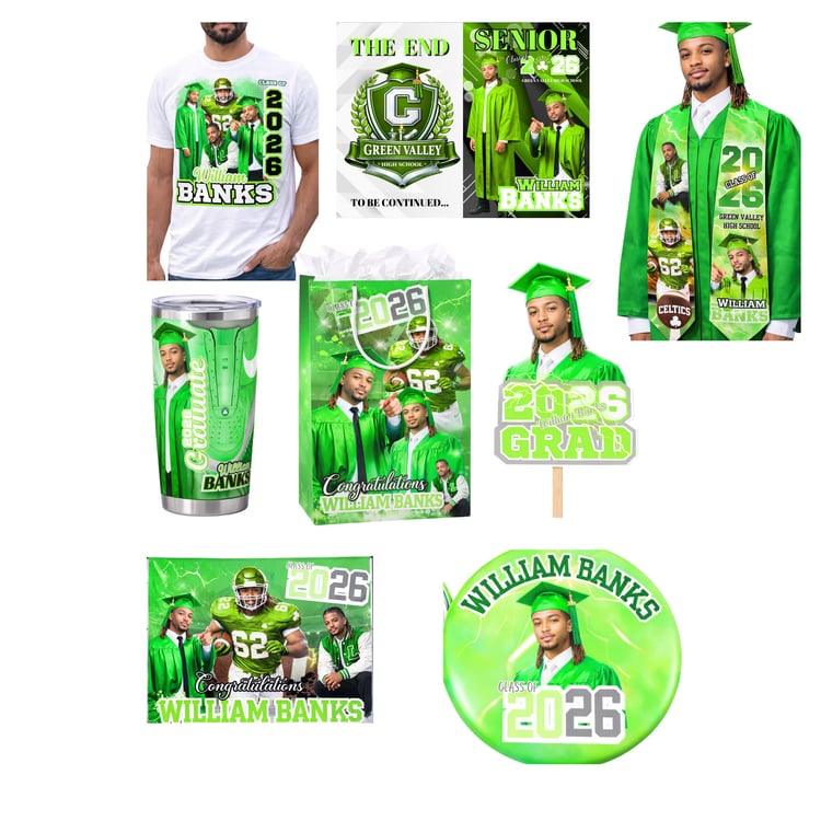 This package brings together custom apparel, party items, and keepsake pieces to create a coordinated graduation experience centered around your graduate’s photos, school colors, class year, and theme.