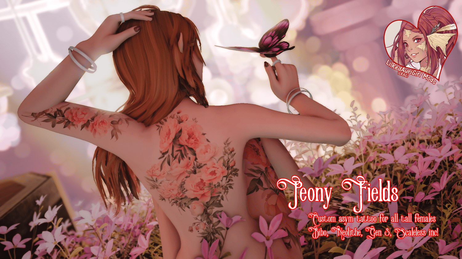 Beautiful wild peonies decorate the body in this asymmetrical tattoo for Bibo (smooth), Neolithe, and Gen3 (smooth) bodies, including both vanilla and scaleless for Au Ra.
