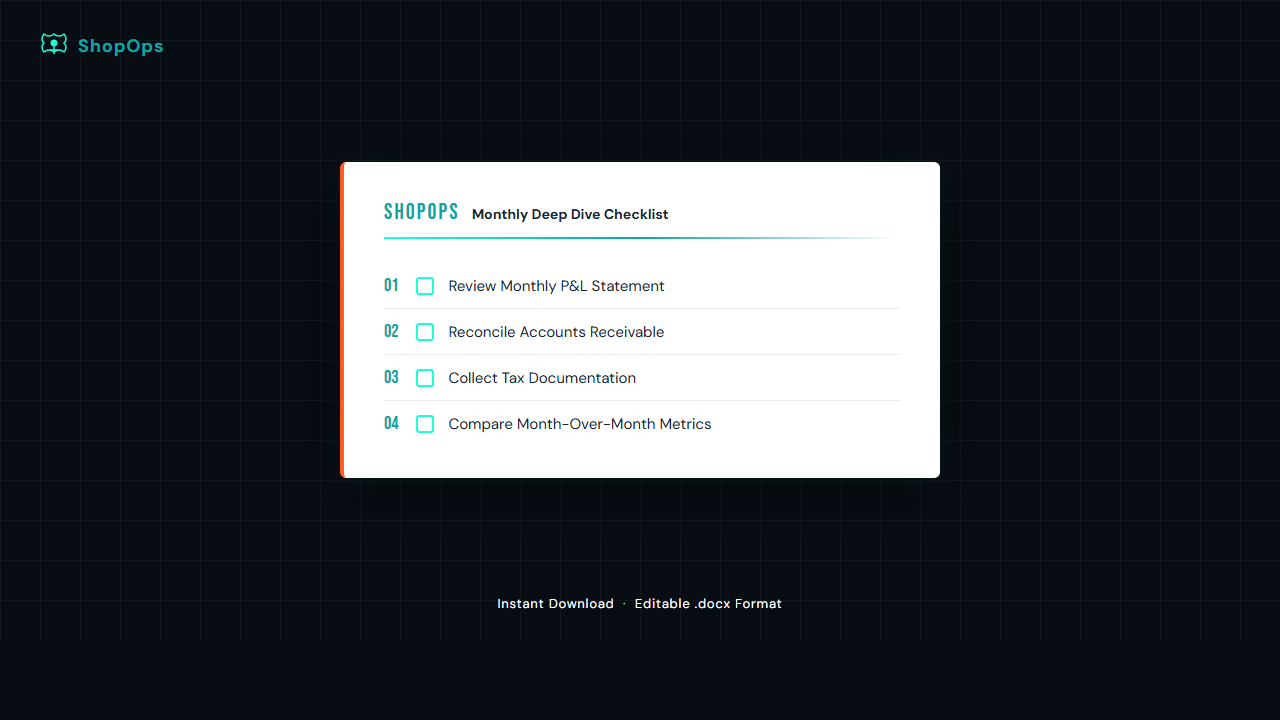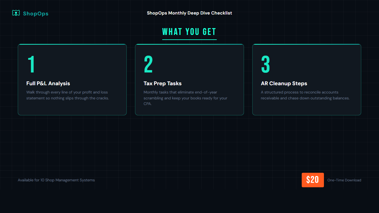 The complete monthly operations checklist for Tekmetric users. Includes the full checklist + Companion Guide. Exact, click-by-click workflows to run your shop management system with zero guesswork. 100% platform-specific. Zero generic advice.