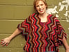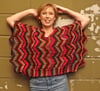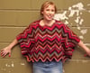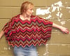 Can be worn in two different directions: wear it with the zig zag stripes across or wear it with the stripes up and down. Such a fun knit! Try it with striped assorted odd balls! This is a square shape that measures the same wearing it either direction.