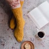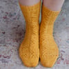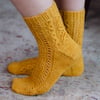 These sunny socks are worked from the cuff down, beginning with a stretchy cast on and a ribbed cuff. The stitch patterns are both charted and written out, and are mirrored on each leg. They feature an Eye of Partridge heel flap and gusset and the soles are worked in stocking stitch.