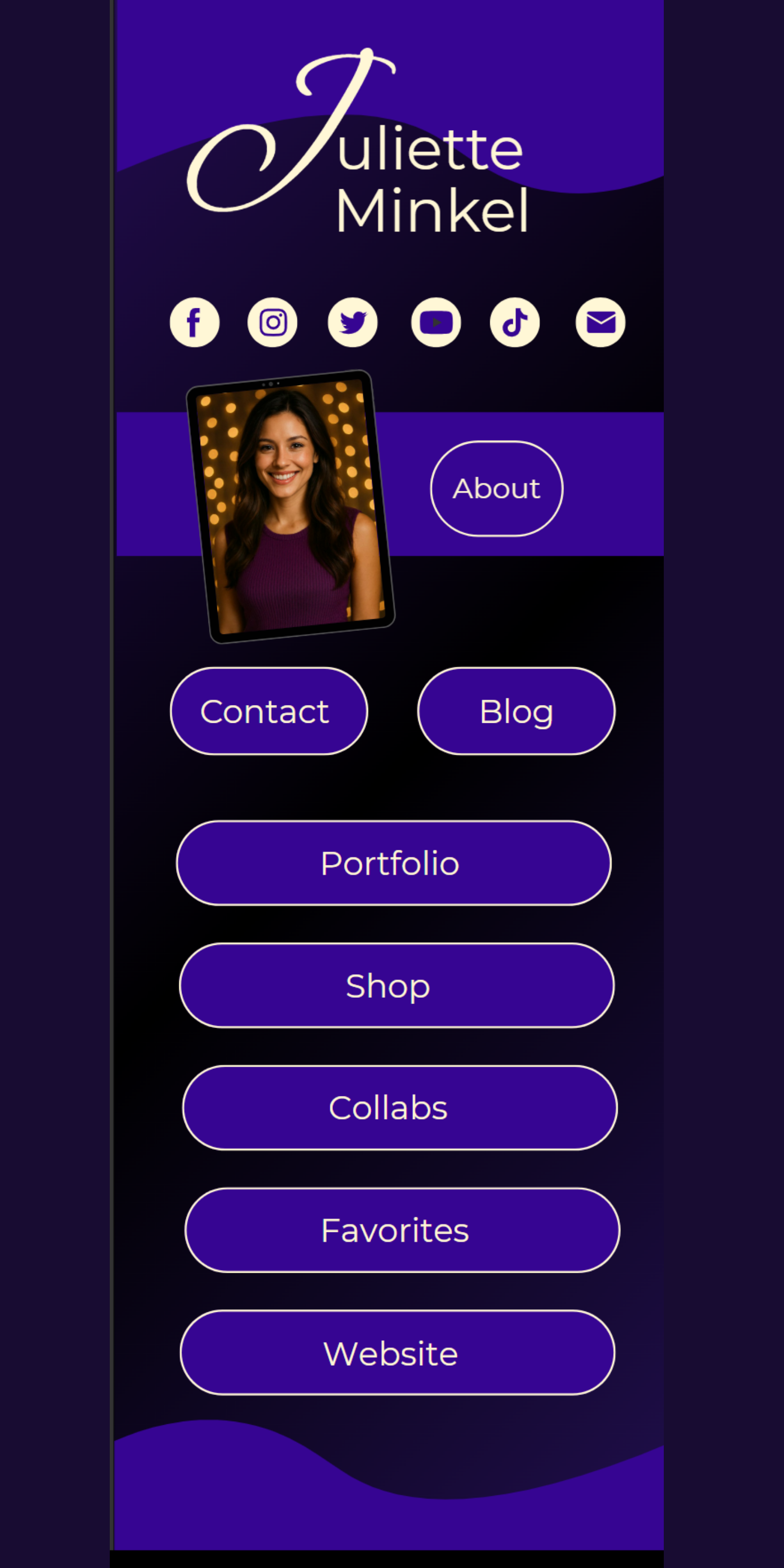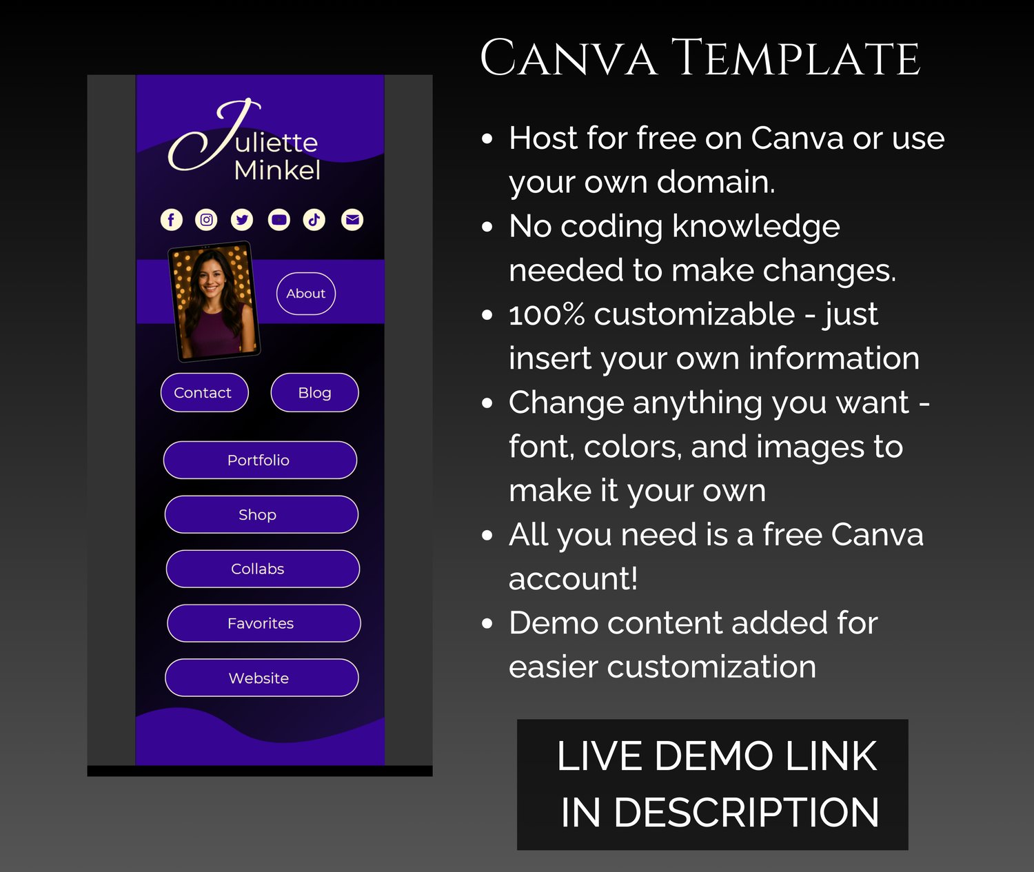 Upgrade your online presence with this elegant, dark purple, luxury, feminine Link in Bio Canva template, designed to look stunning on both mobile and desktop. Fully customizable and easy to edit, it helps you create a polished, professional landing page in minutes. Perfect for influencers, UGC creators, coaches, bloggers, authors, shop owners, and anyone who wants a bold, modern online aesthetic.