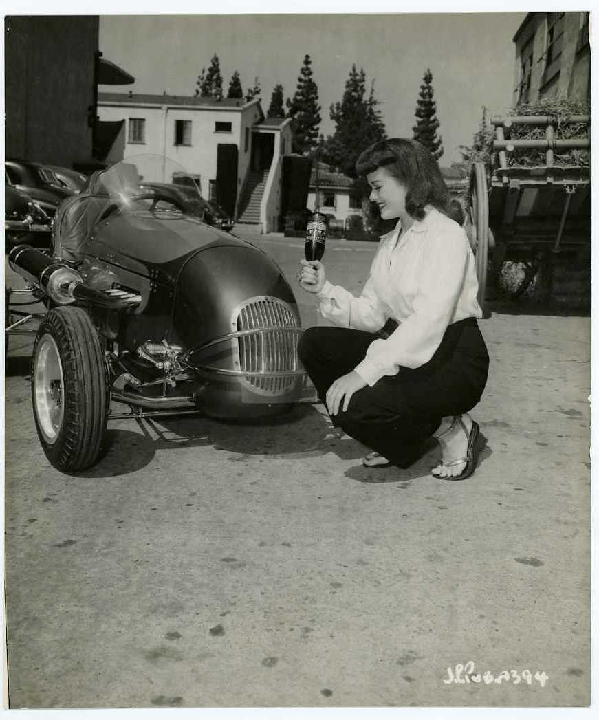 An original vintage publicity photo of Janis Paige pictured with a midget racer.
