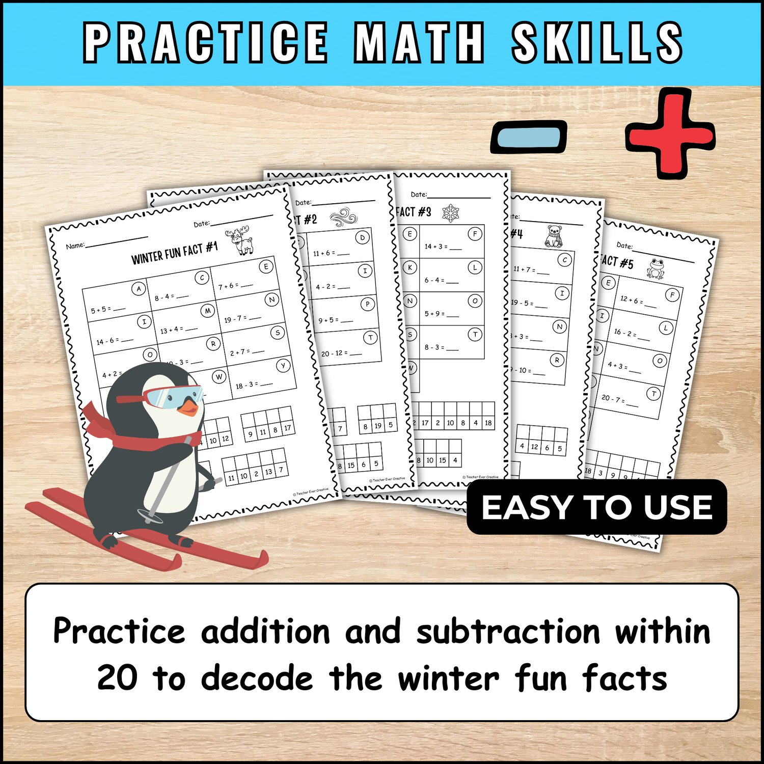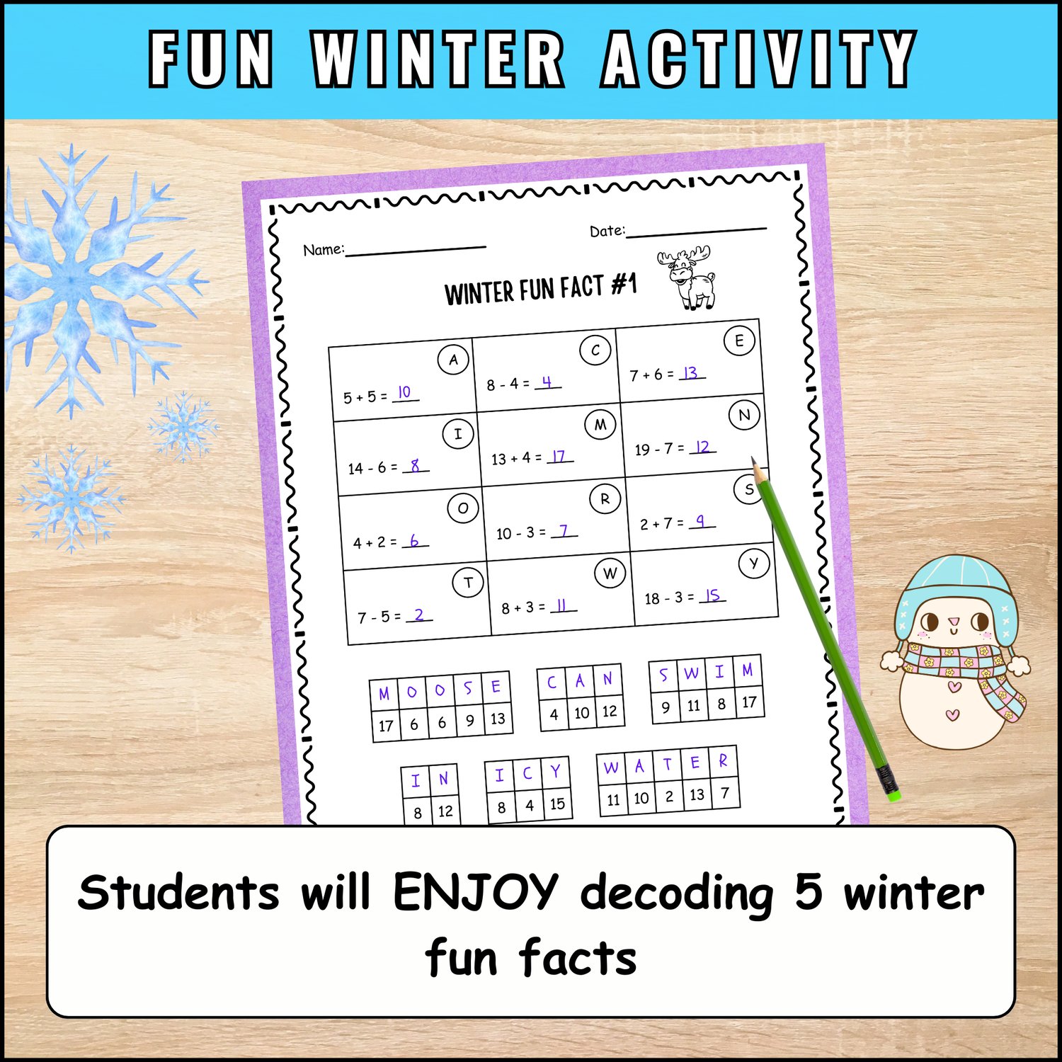 Winter Crack the Code Cryptogram Fun Facts Math Addition & Subtraction within 20