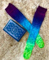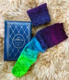 Take a tumble down the rabbit hole with these endlessly long stockings! What a perfectly warm, scrunchie, knee-high sock. These are great socks for a knitting project that is easy to do around company, watching movies, or just a simple hand distraction. Down the rabbit hole socks are worked toe-up using Shirley Brian’s Deconstructed fade sock yarn, but they can work with any single skein striped or variegated yarn as well (two skeins for large and up).