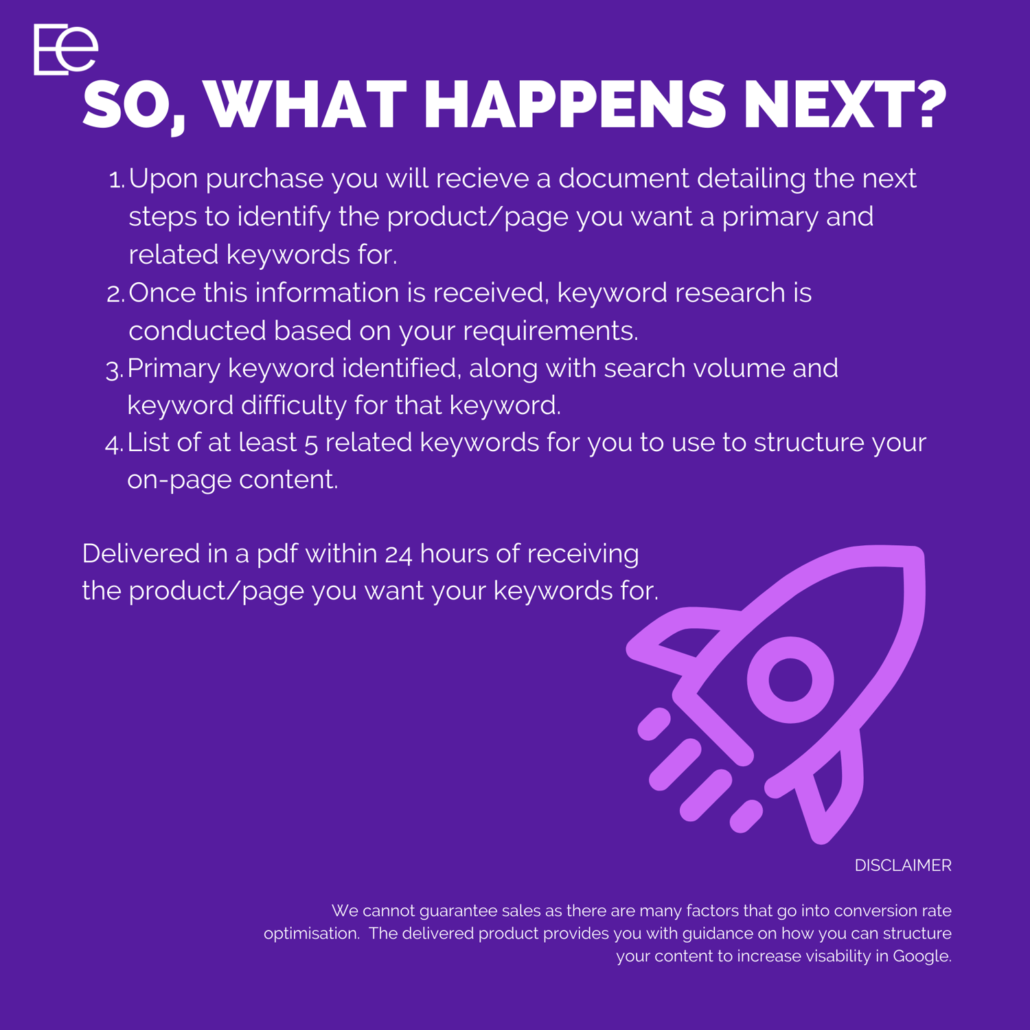 Upon purchase please submit the website link to the page you want to optimise, and let us do the rest! You will receive your keyword + list of relevant keywords within 24 hours.