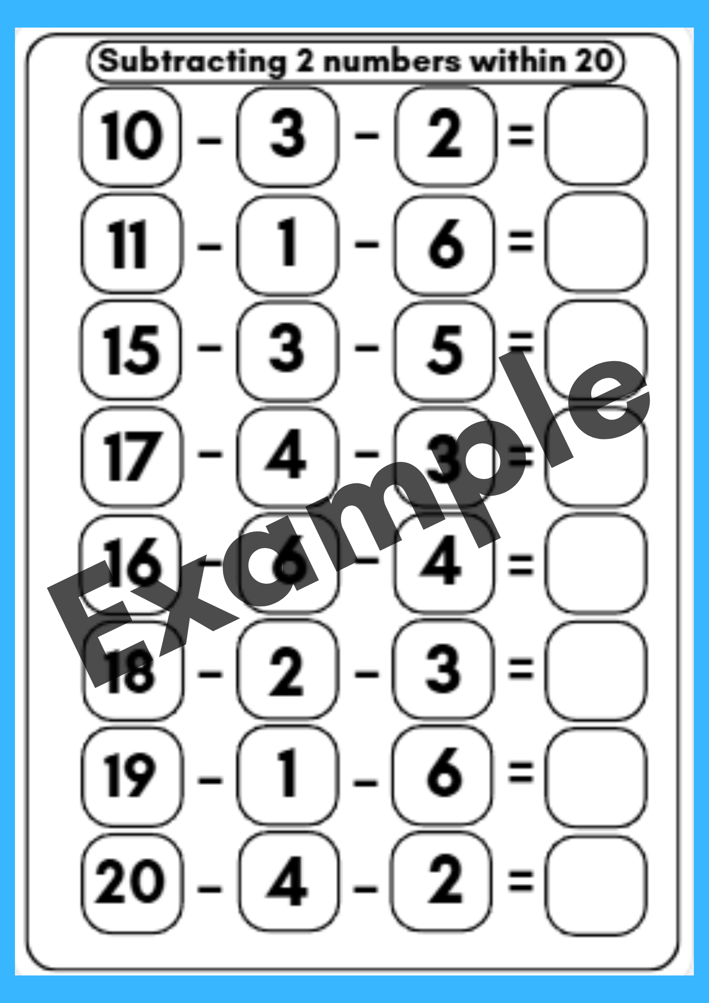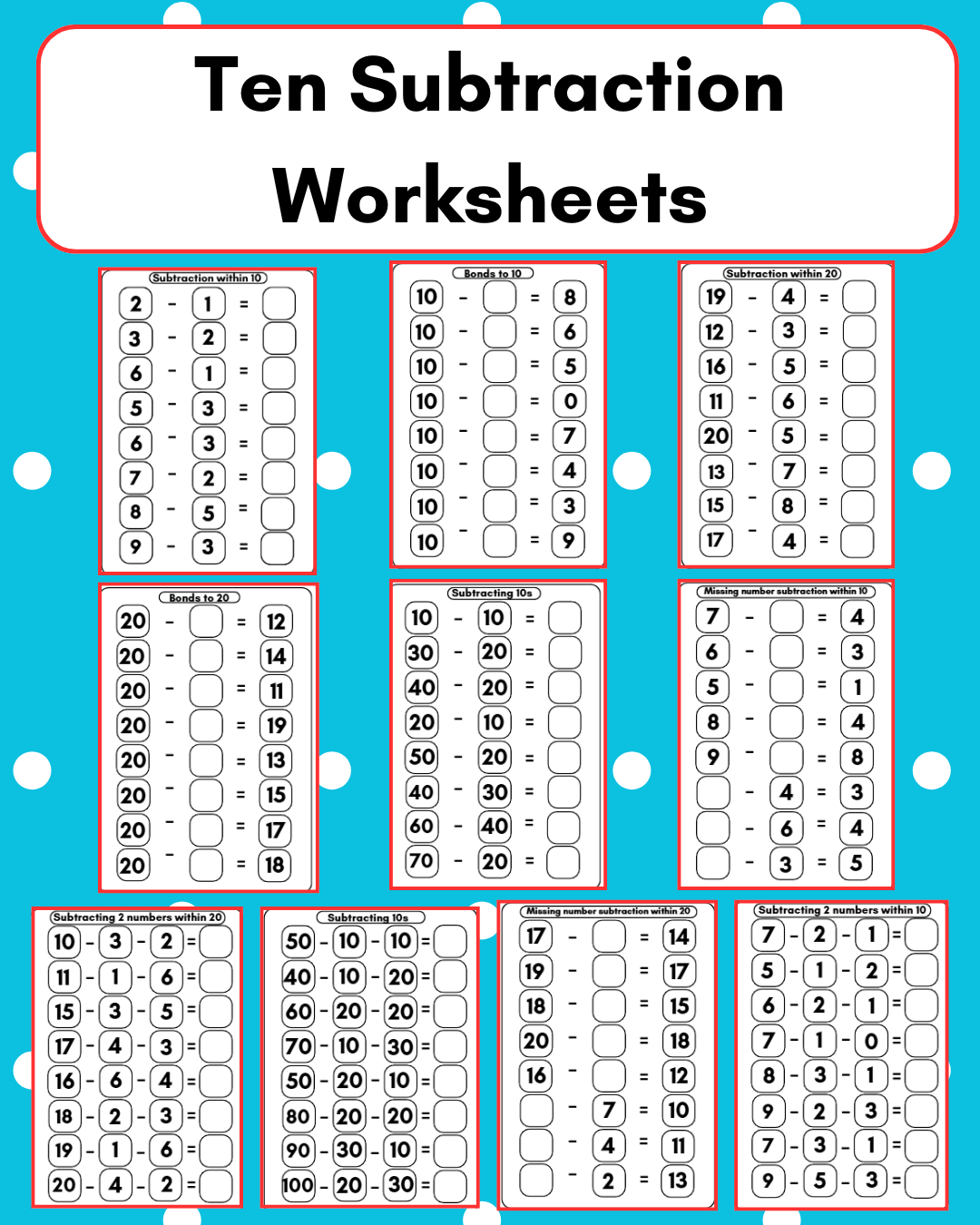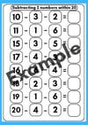 A collection of ten subtraction worksheets suitable for KS1 students. They include: