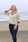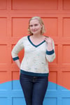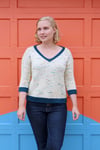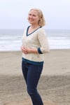 The Seaside V-neck is knit from the top-down, beginning with the MC yarn and a provisional cast on for the shoulders and back of the neck. The back is worked first, then the provisional cast on is carefully undone and each front side is knit separately with matching short row and neckline shaping. When complete, the fronts and back are joined together under the armholes and the body is knit in the round toward the hem. Stitches are picked up and knit in the round for the 3/4 sleeves and neckline. All of the ribbed edges are made using smaller needles and the CC yarn.