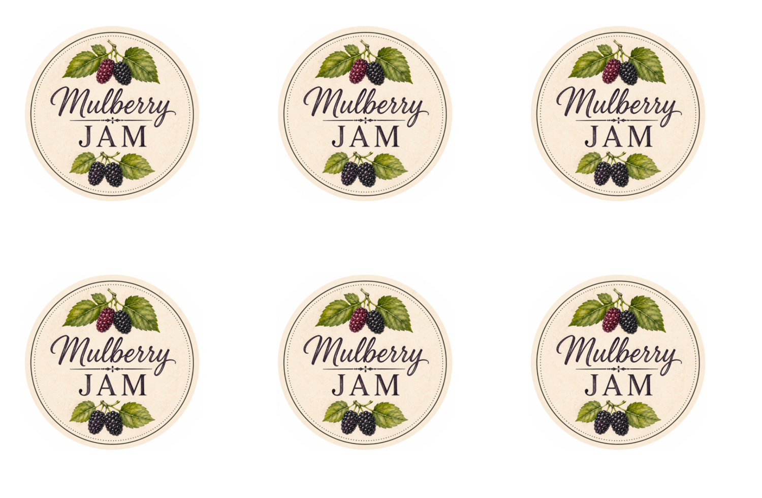 This downloadable PDF includes a full sheet of round “Mulberry Jam” labels designed to fit Avery 22807 (2-inch round labels). Just print, peel, and stick for an easy, professional look.