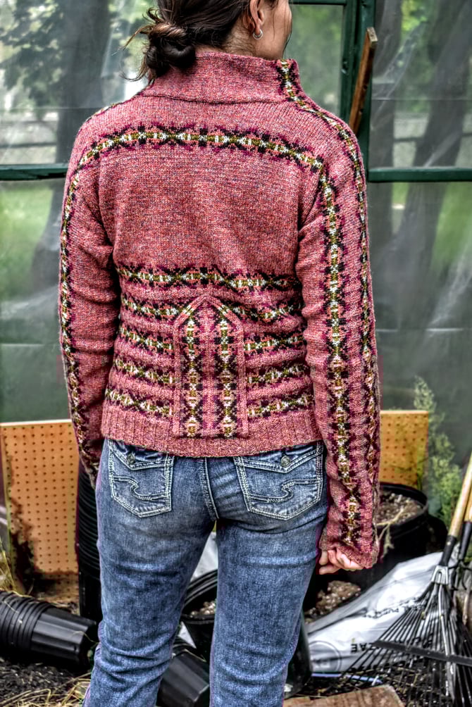 The newest addition to the Stepaside Collection. Both the upper half and each lower half of this top-down dolman are each formed in one group of three entities, a Trinity. The sweater starts out with one Fair Isle band which begins the collar, sleeves and upper body all at the same time, and is then steeked (making a great project for first time steekers!). Once the upper body is complete and the sleeves joined using a 3-needle BO, the lower body is worked in the round. The Fair Isle bands in the lower body have a triple point at the front and back centre where the Stepaside pocket miter construction connects the front pocket and back vertical embellishment, then the lower body is continued in the round to the hem.