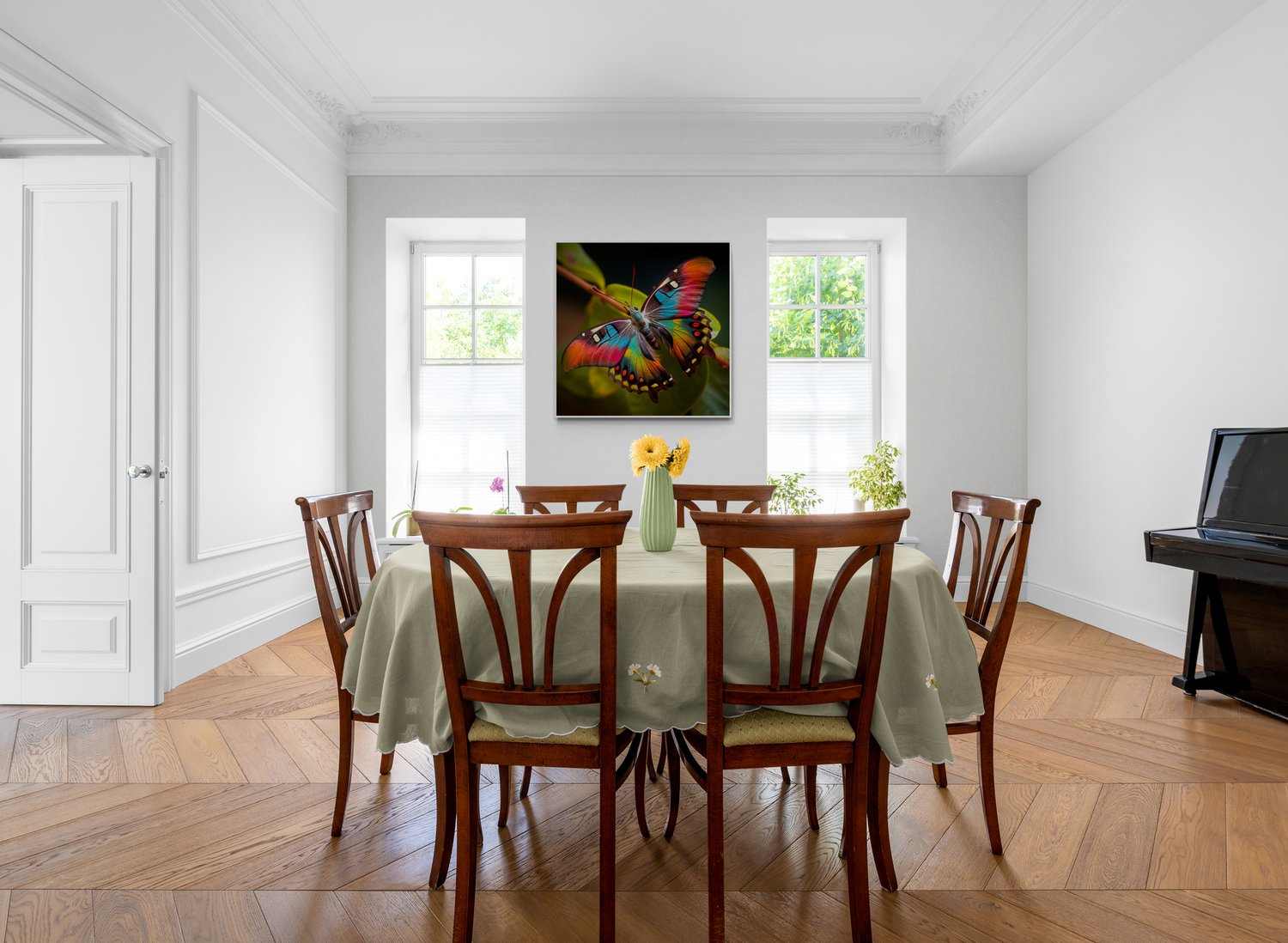 AI artwork that shows the breathtaking beauty of a Madagascan Sunset Moth perched delicately on a leaf, representing faith and determination unlike most moths, the sunset moth flies by day.