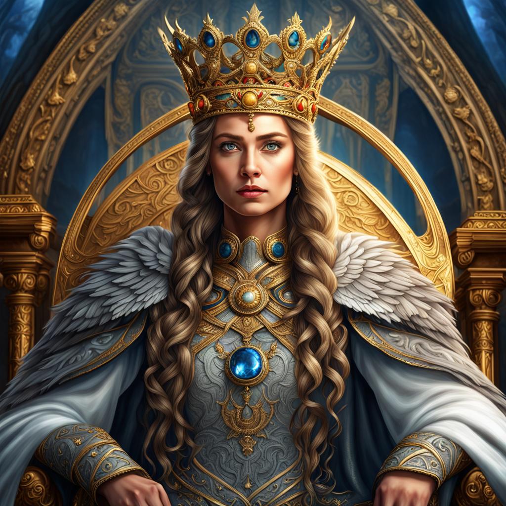 Adorned with a resplendent royal crown and flowing robes befitting her regal stature, the valkyrie queen commands the attention of all who behold her. Every intricate detail, from the shimmering jewels of her crown to the rich textures of her garments, is rendered with astonishing realism, transporting viewers to a world of fantasy and intrigue.