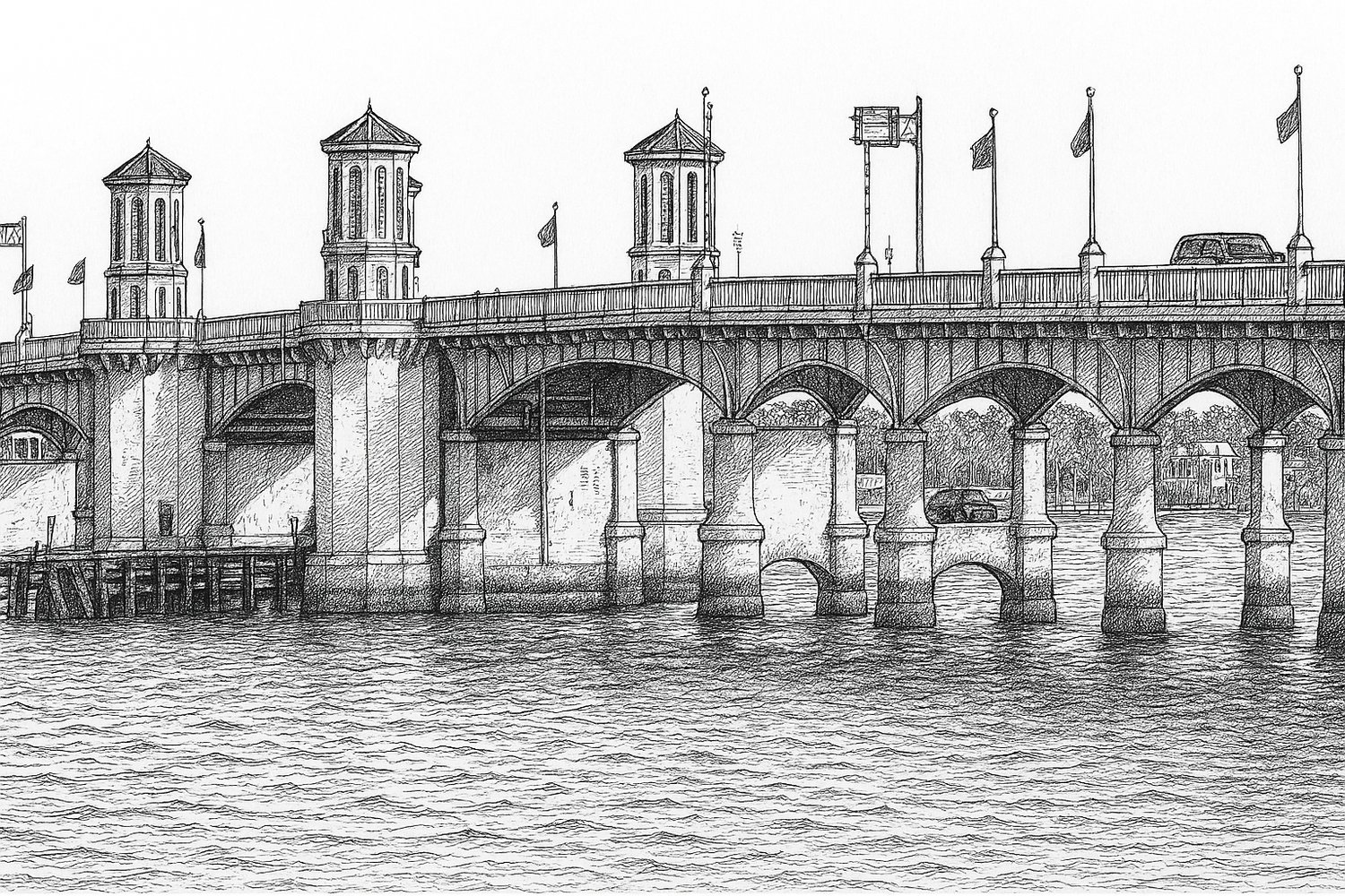 The Bridge of Lions in St. Augustine is a national historic landmark. This pen and ink drawing can be used to make a small print suitable for framing. The drawing was created by Chat GPT4.