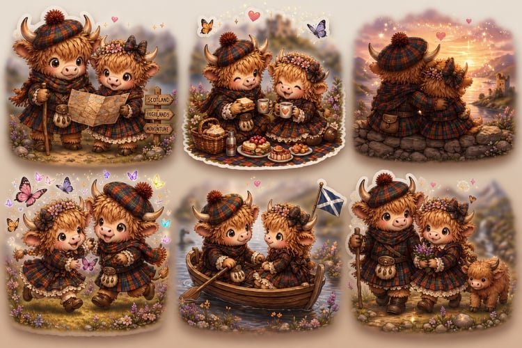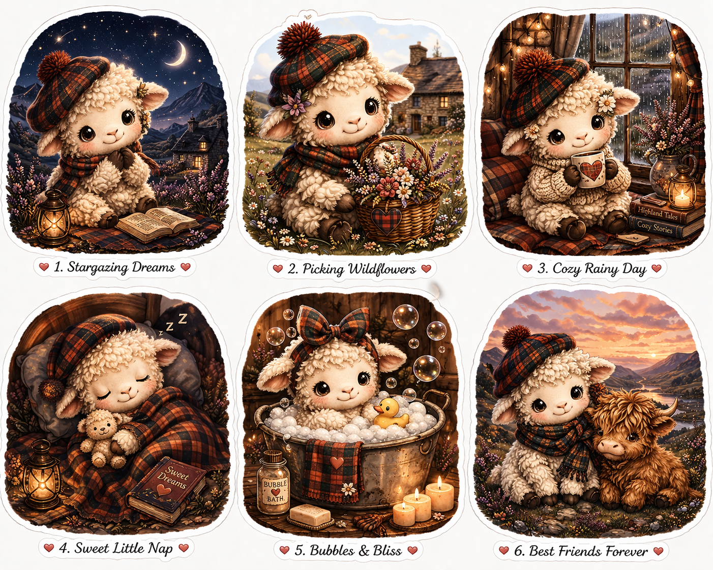 From peaceful stargazing nights and flower-filled meadow days to warm tea moments and dreamy naps, each sticker is designed to bring a sense of relaxation and happiness. With fluffy textures, gentle pastel tones, and cute Scottish-inspired details, this set is perfect for anyone who loves soft, wholesome aesthetics.