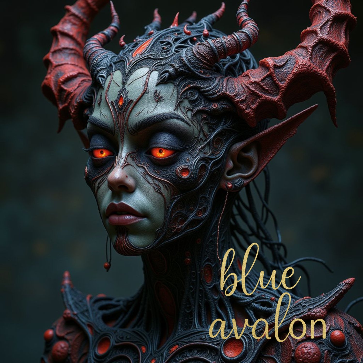 Known as the Dark Angel, this haunting portrait blurs the line between fallen grace and demonic power. Her face is half-veiled in shadowy black vines, her red eyes glowing. Blood-red horns curve from her head, and faint traces of crimson shimmer beneath the blackness of her form - like fire beneath ash. A powerful, unsettling figure of beauty, danger and myth.