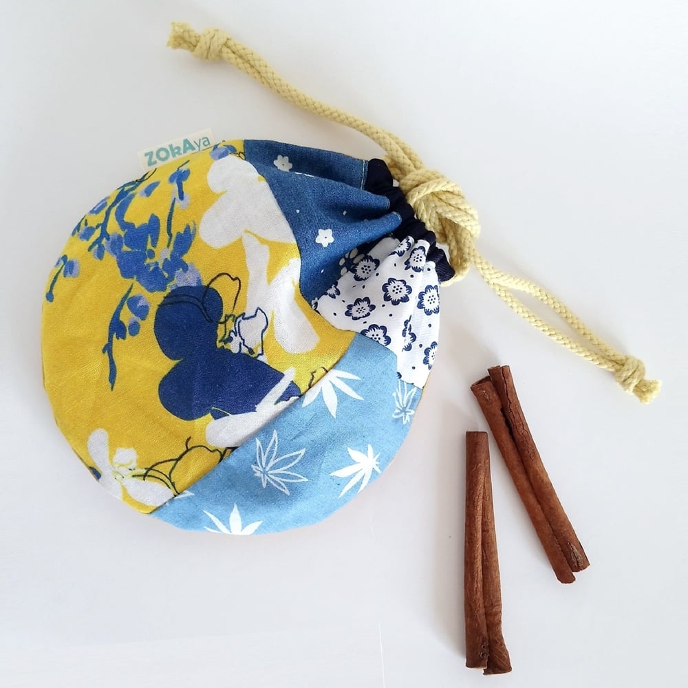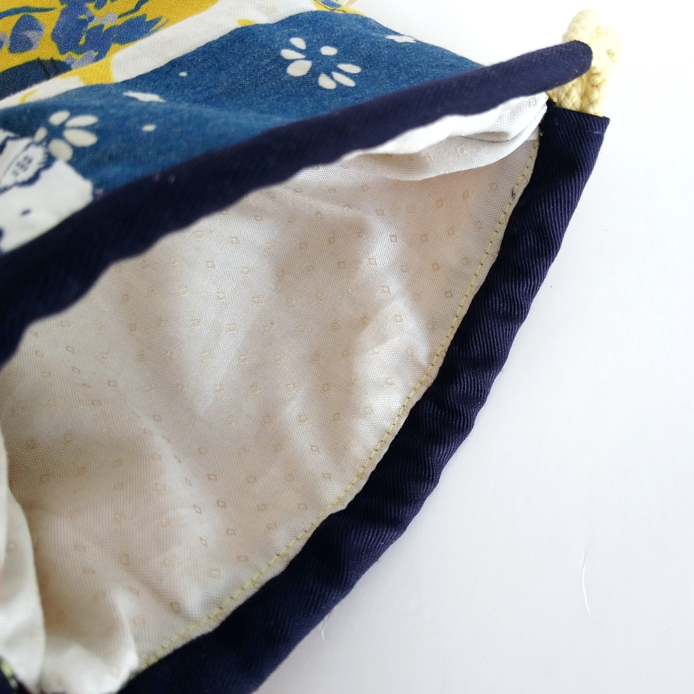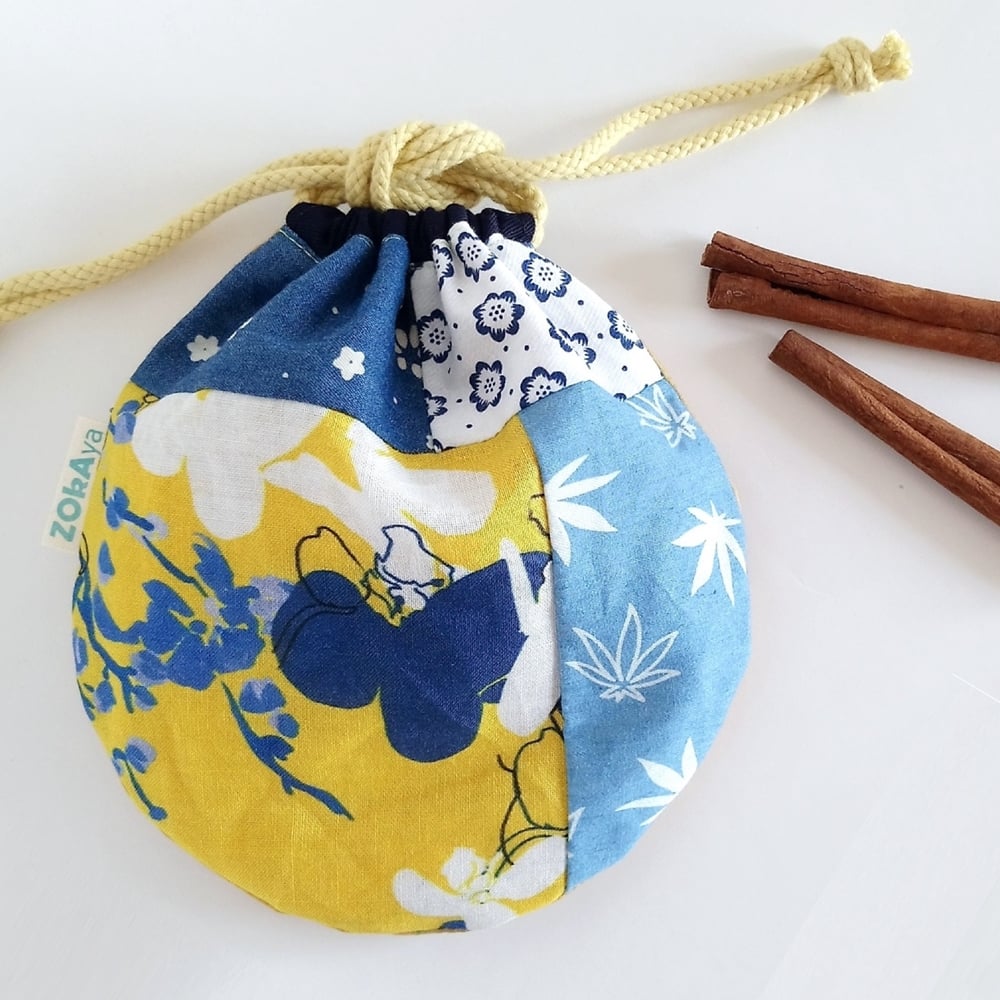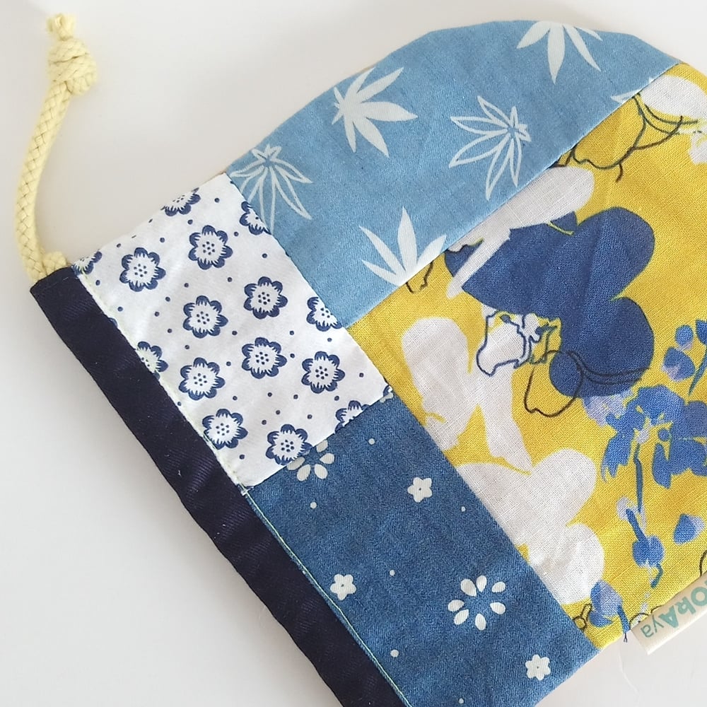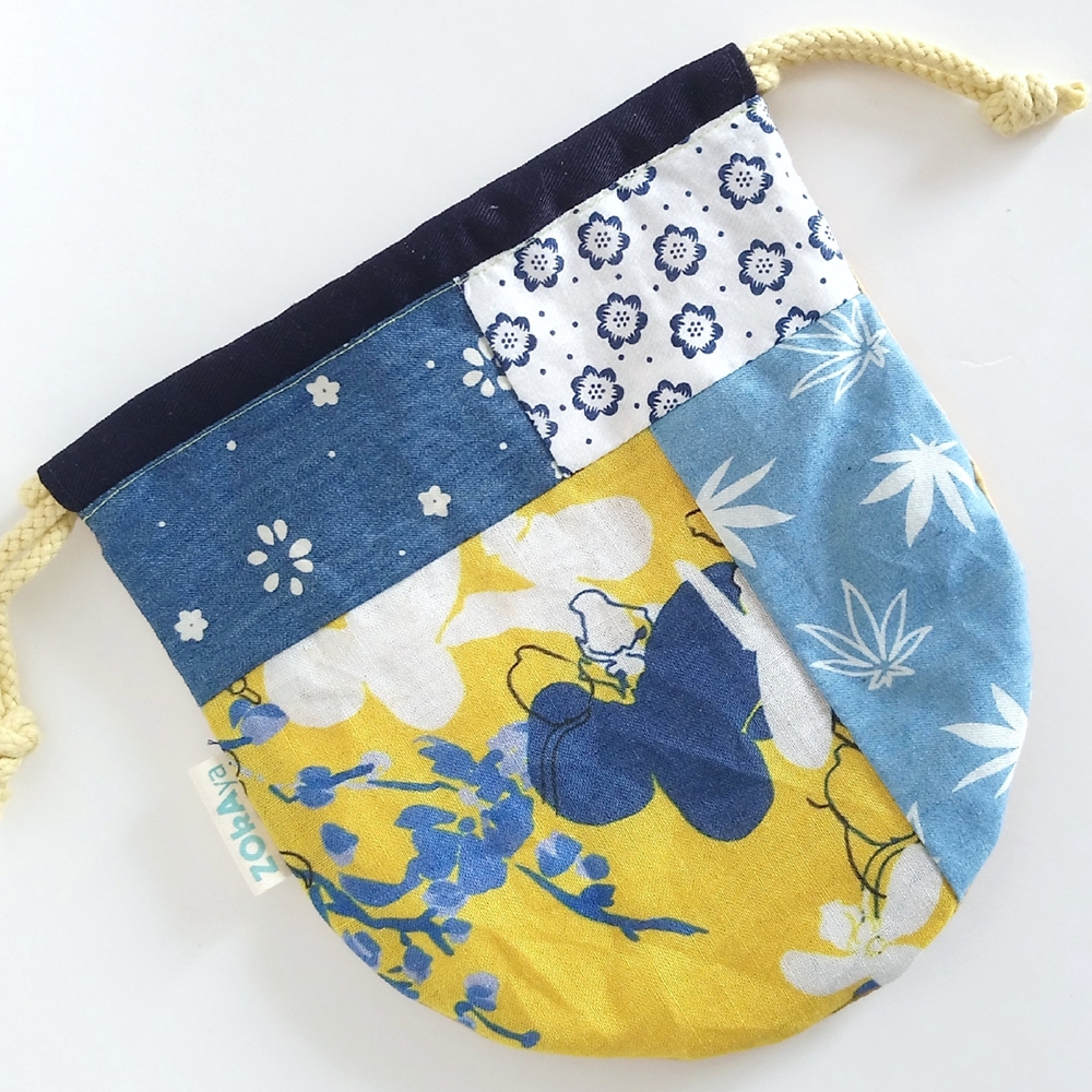 Round Patchwork Drawstring Bag (Japanese-style x Yellow, Blue)