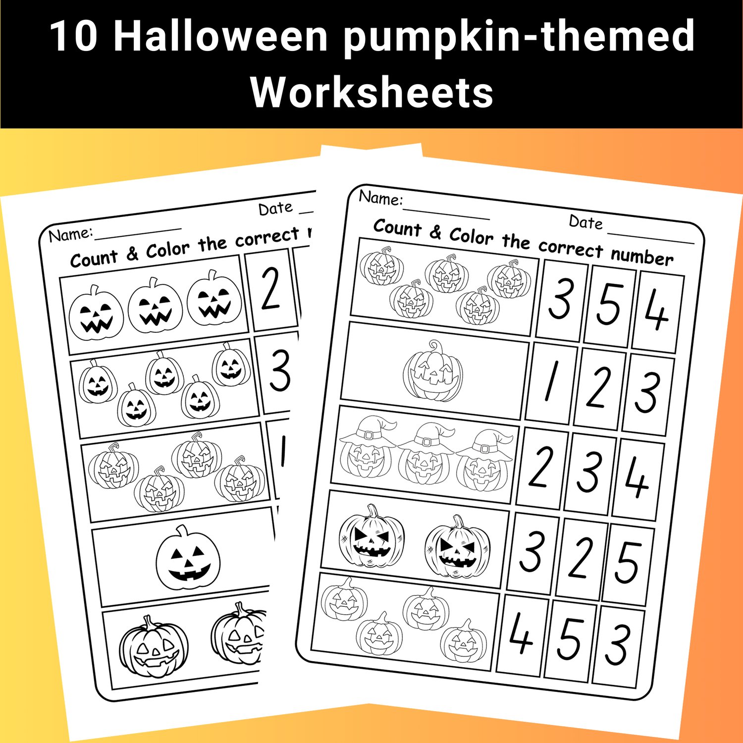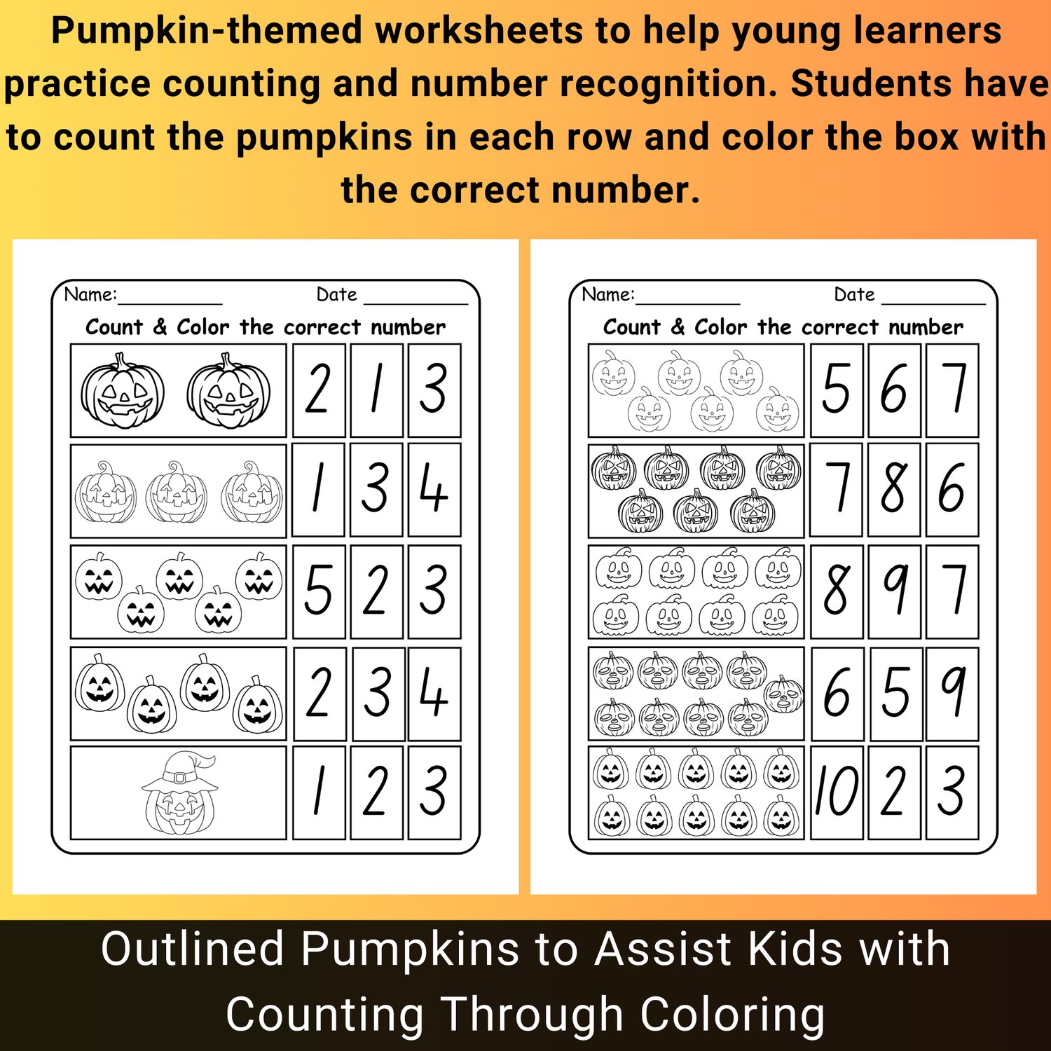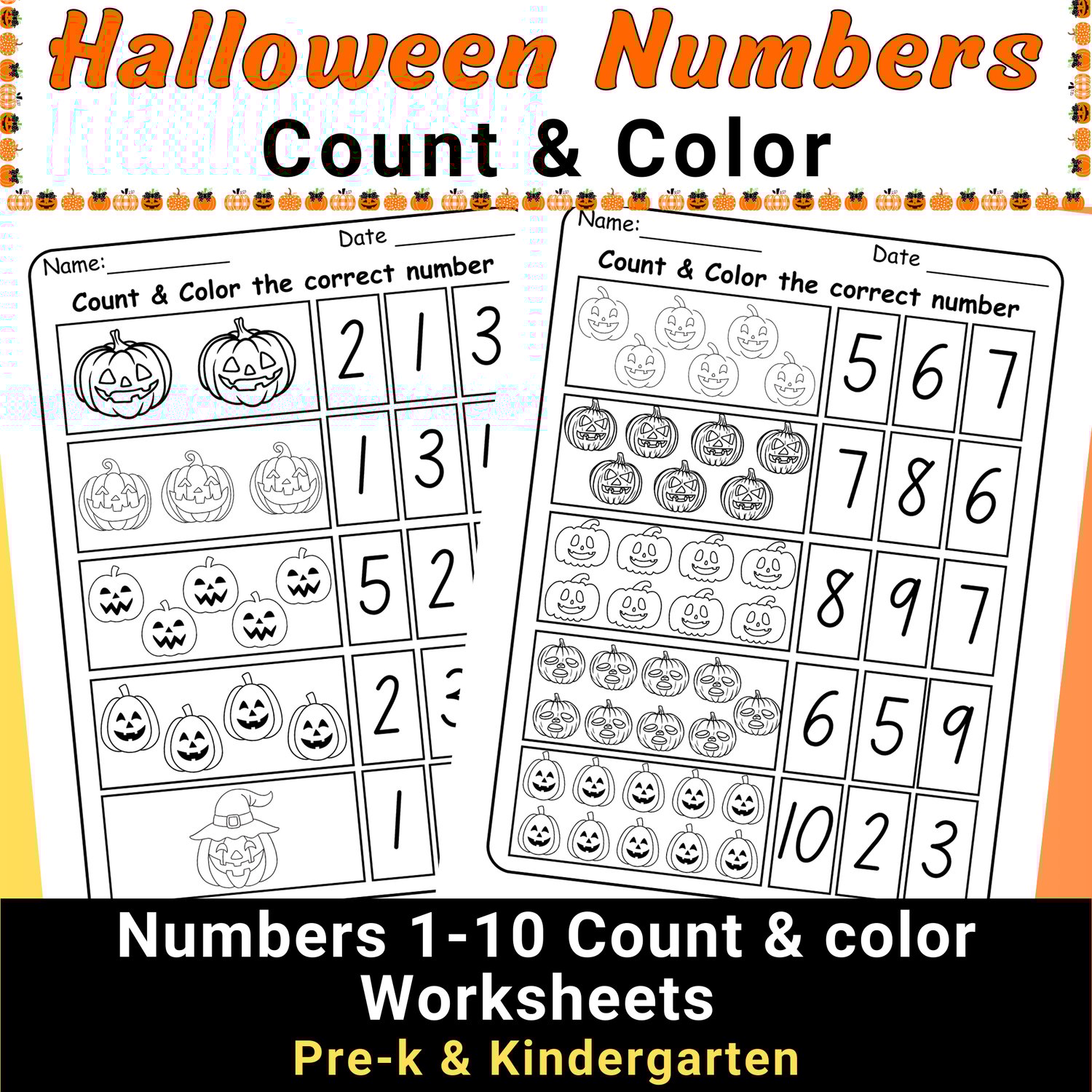 Halloween Pumpkin Count & Color Worksheets 1-10