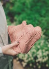 Shown in Pénélope by De Rerum Natura (90% organic Merinos d'Arles, 10% mulberry silk; 145 yards / 133 meters per 50 grams). Color: Argile; 2 balls