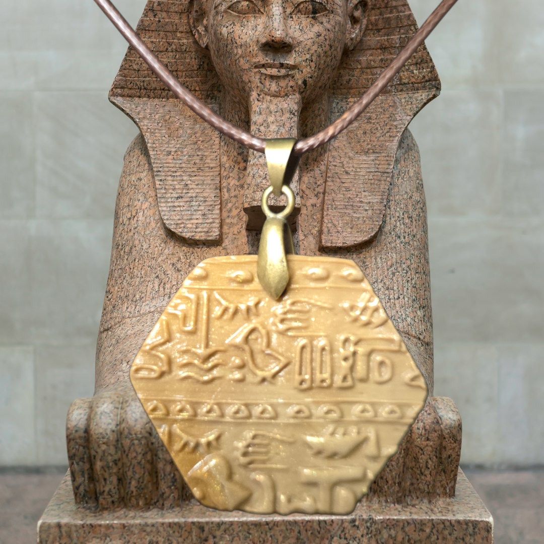 Handmade polymer clay necklace featuring a sand-gold pendant embossed with an ancient-style hieroglyphic pattern. The textured, geometric pendant hangs from a brass-tone bail on a brown cord, giving it an earthy, Egyptian-inspired look. Lightweight, eye-catching, and perfect as a statement piece or unique gift.