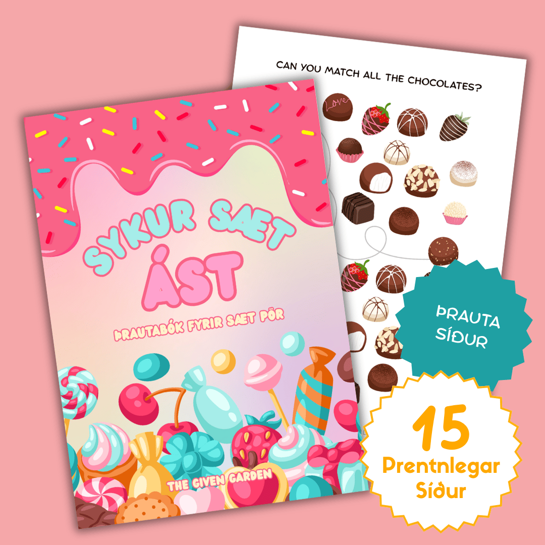 Sykur Sæt Ást - 15 síðna prentanleg lita- og þrautabók