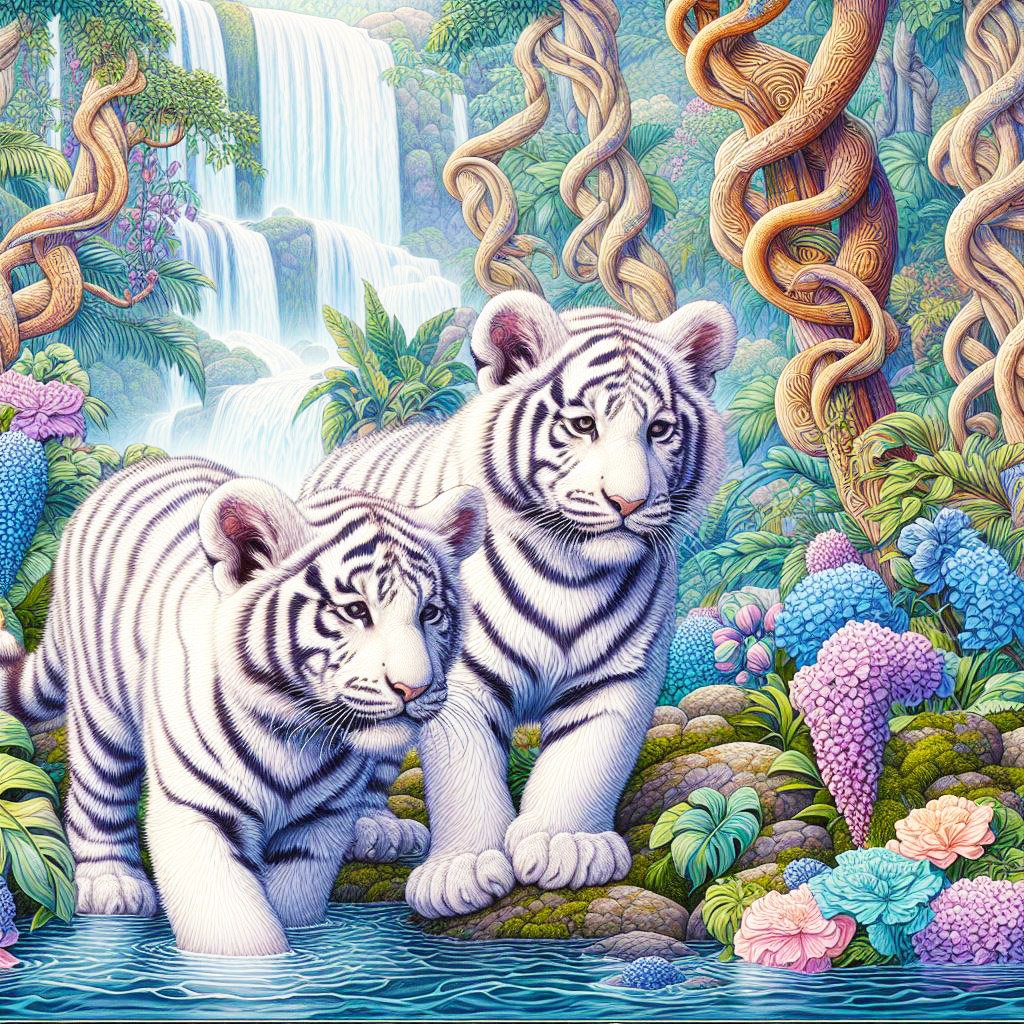 White tiger cubs wading into water. There is a waterfall behind them & there are curly twisty trees with colourful patterns & a tall colourful exotic plants & flowers.