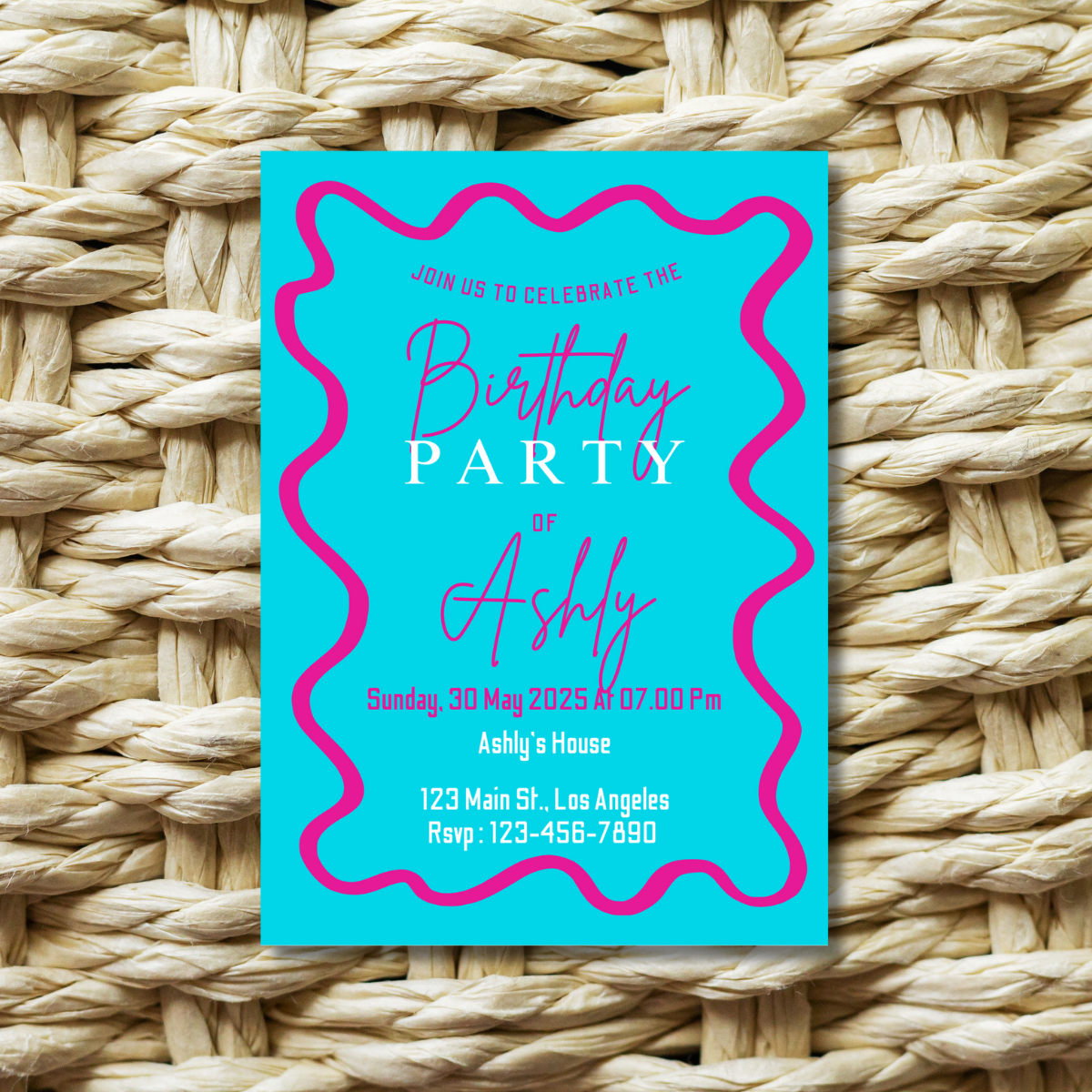 Editable Retro Wavy 70s vibes Birthday Party invitation template. The template can be fully personalized, and include frame and background colors!